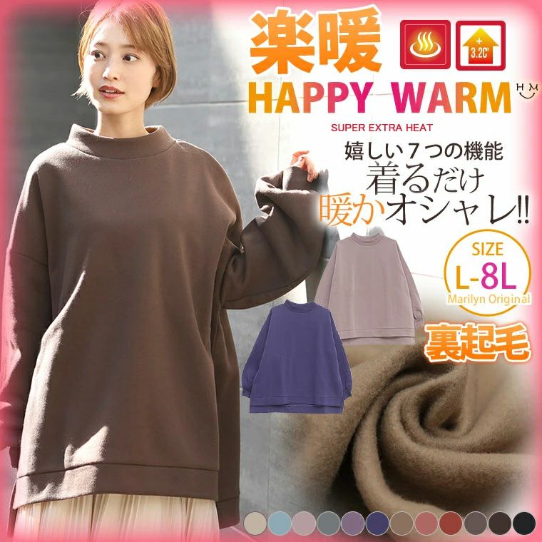 HEAT裏起毛 すっきり美人な華奢魅せ小顔のボトルネックトップス 裏毛 トレーナー