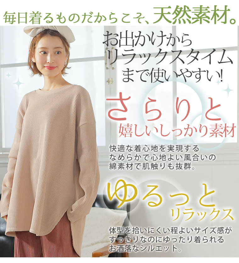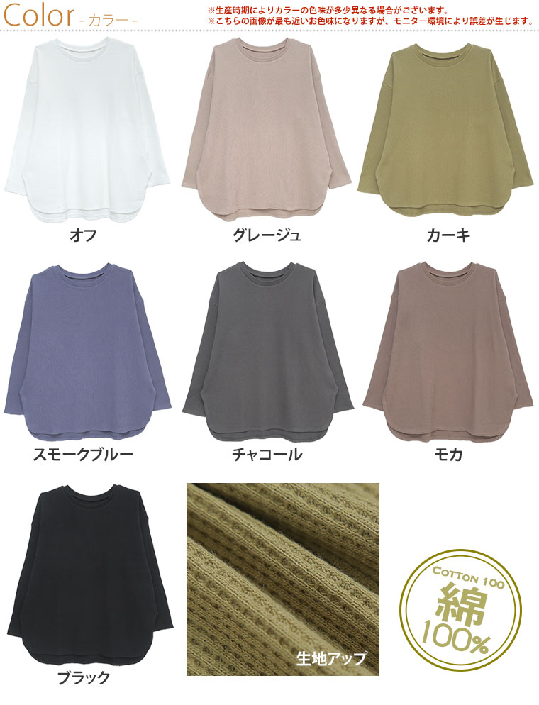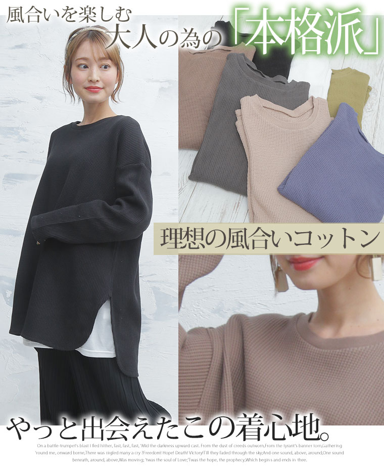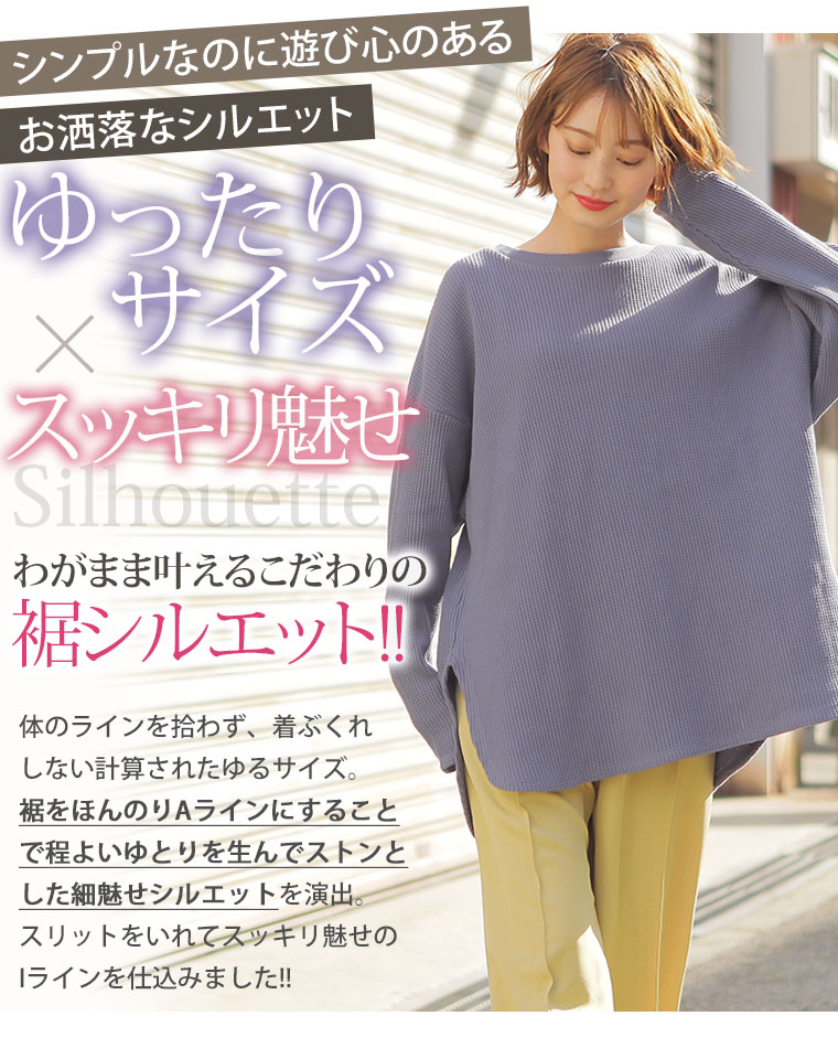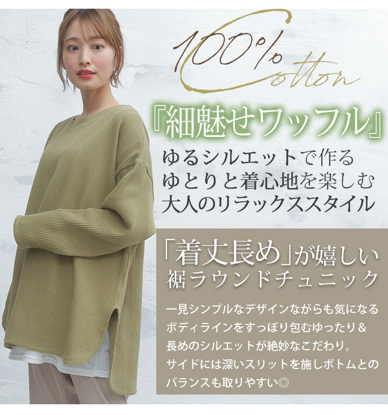さらりコットン100% ゆるっとお洒落な裾ラウンドが嬉しいワッフルトップス