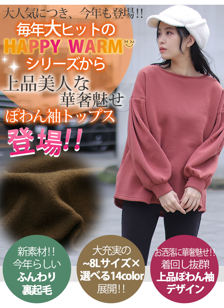 大きいサイズ HAPPYWARM お肌に優しい嬉しい7つの機能 発熱 保温 保湿 吸汗速乾!! HEAT 裏起毛 ぽわん袖 トップス