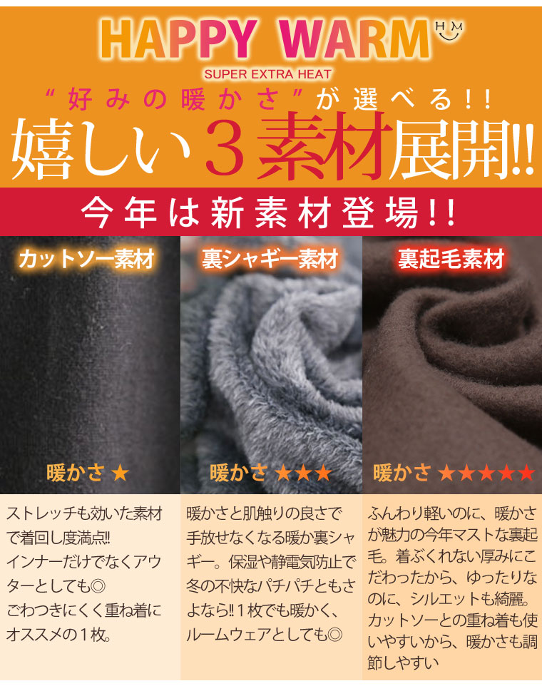 HAPPY WARM お肌に優しい嬉しい7つの機能 発熱 保温・保湿 吸汗速乾!