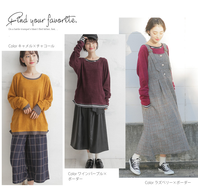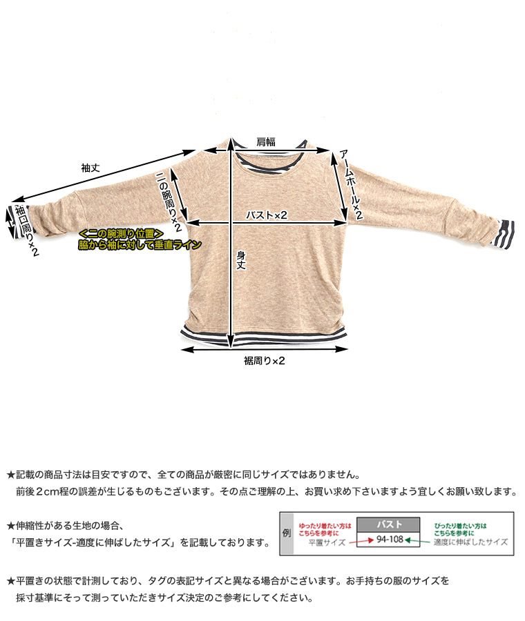 全体的に程よいゆとりのある、ジャストなサイズ感で着用出来ました。指穴の位置もバッチリでした。重ね着風な配色が可愛いですね。楽ちんお洒落の強い見方になりそう♪