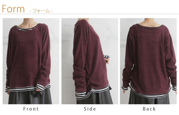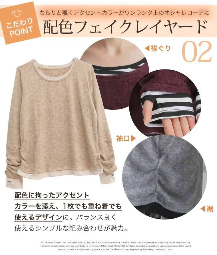 3. 大きいサイズ ブークレニットソー素材 フェイクレイヤード 指穴付き 長袖 プルオーバー