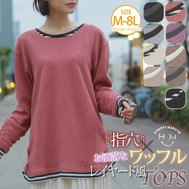 お洒落なデザインとさらりとした着心地の指穴付きワッフル素材レイヤード風裾くしゅトップス