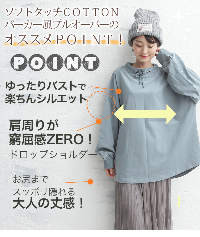 ゆったりバストで楽ちんシルエット!ゆるっと着られるパーカー風プルオーバー