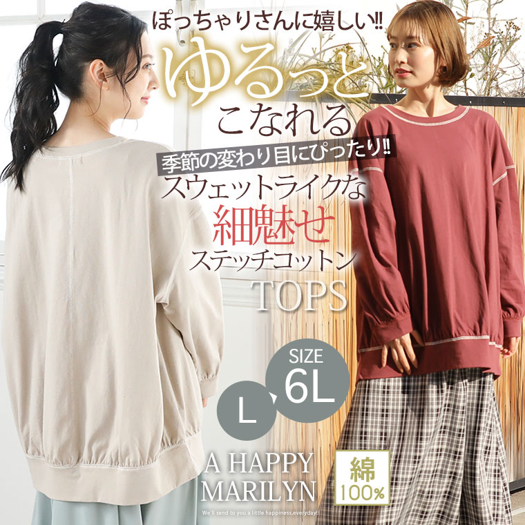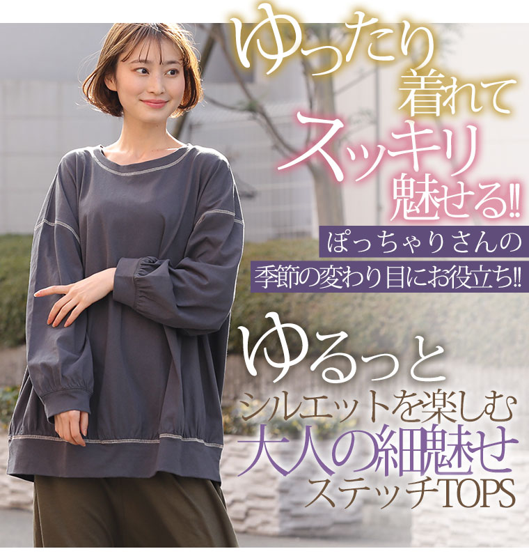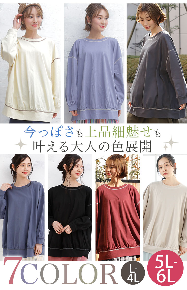 オリジナル トップス カットソー プルオーバー LL 3L 4L 5L 6L 春 春物 春服 ぽっちゃり ゆったり お腹 胸周り 二の腕カバー 腰周り かわいい 綿100% しっかり コットン 配色ステッチ 楽ちん ゆるトップス