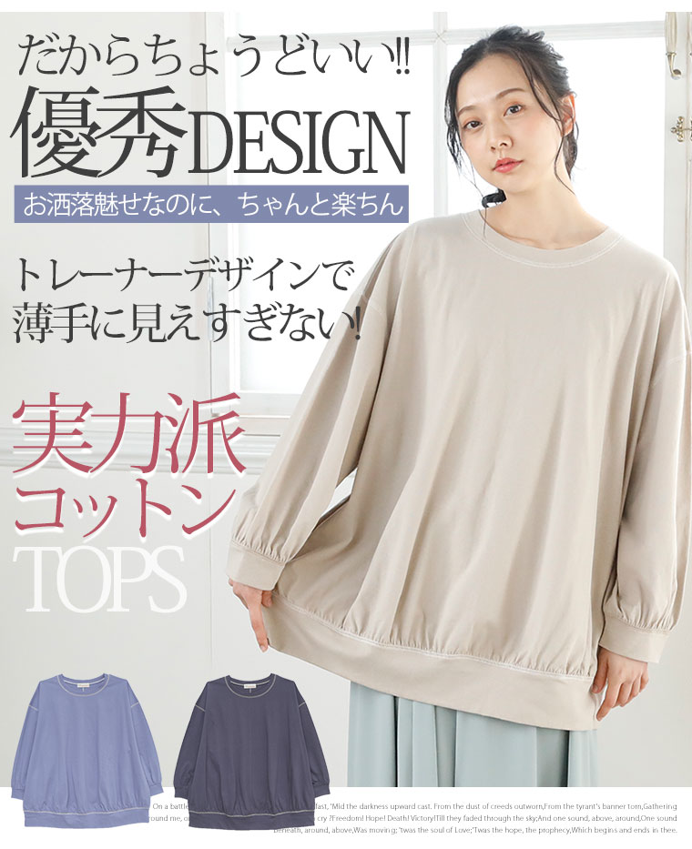 3. 大きいサイズ 綿100% しっかり コットン 配色ステッチ 楽ちん ゆるトップス