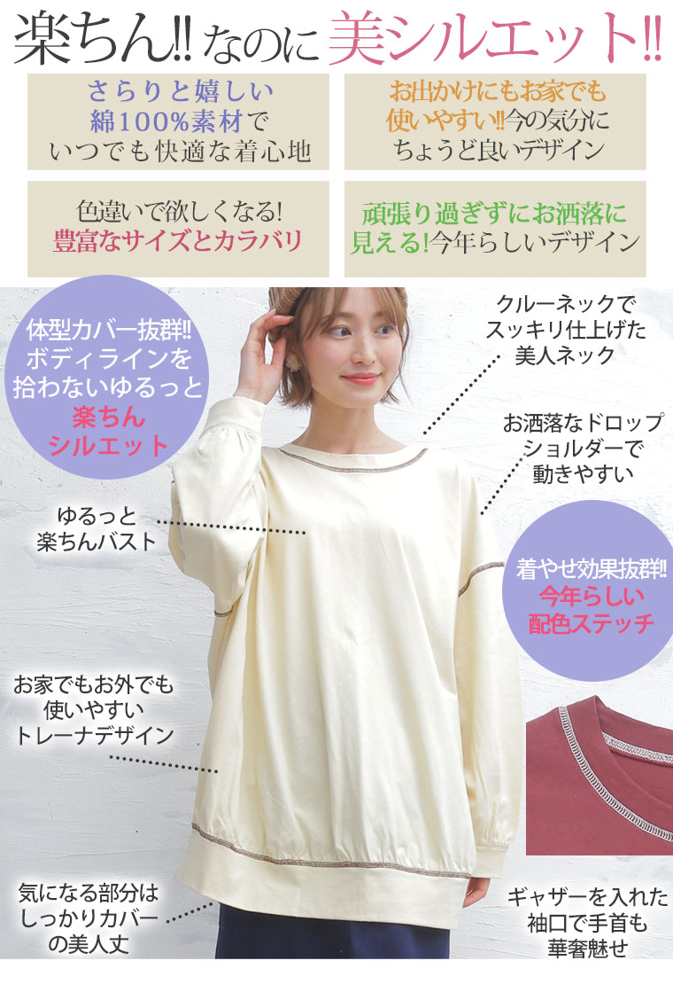4. 大きいサイズ 綿100% しっかり コットン 配色ステッチ 楽ちん ゆるトップス