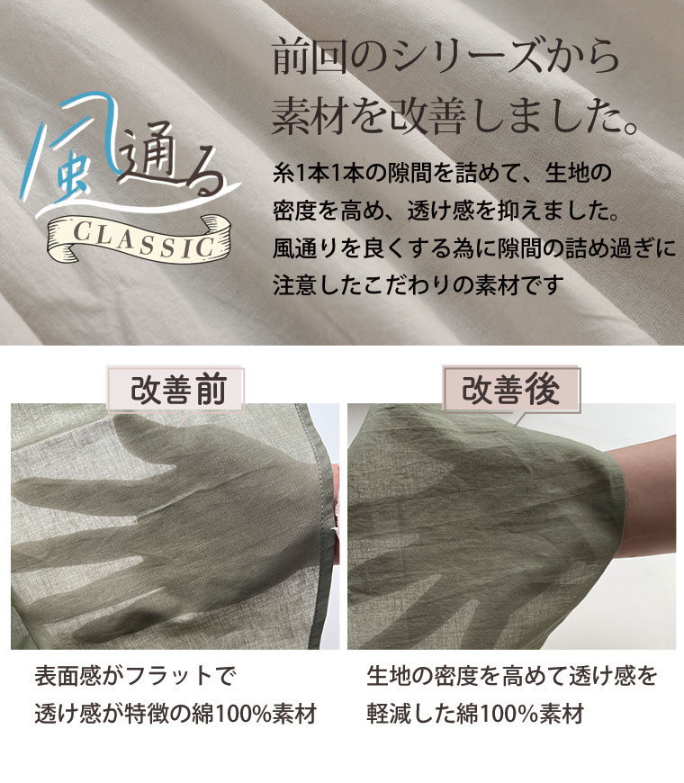 涼しくてなくて、去年購入したので再度また購入!シワになるのが残念だけど、プレミアムではなくてこっちの方がセールで安かったので購入しました。 もっとクラシックタイプも綺麗な色味が欲しいなーと思います。 同タイプの二の腕目立たない半袖も欲しいです!夏は暑いので.... そしてもっとロング丈も希望します!