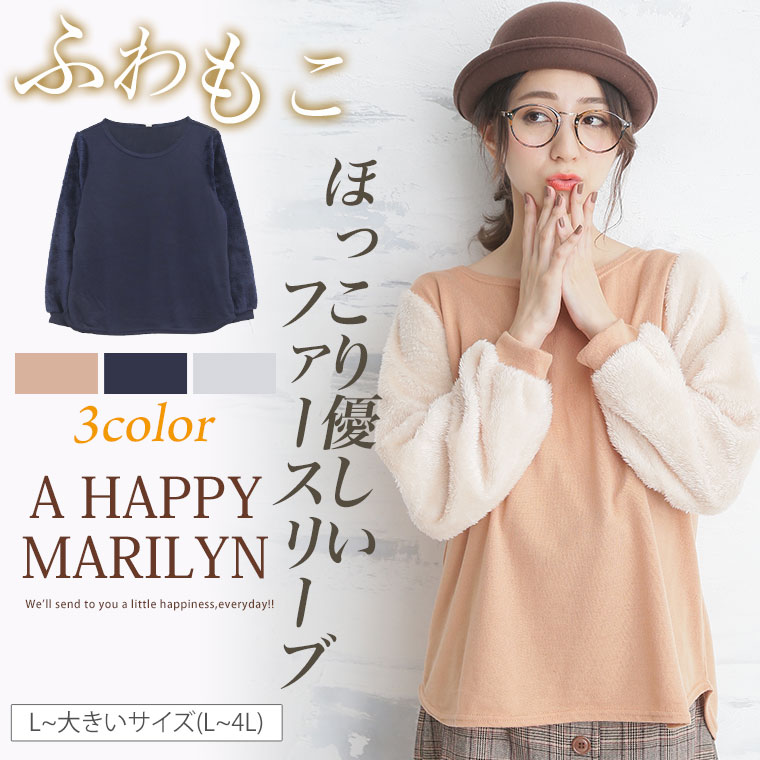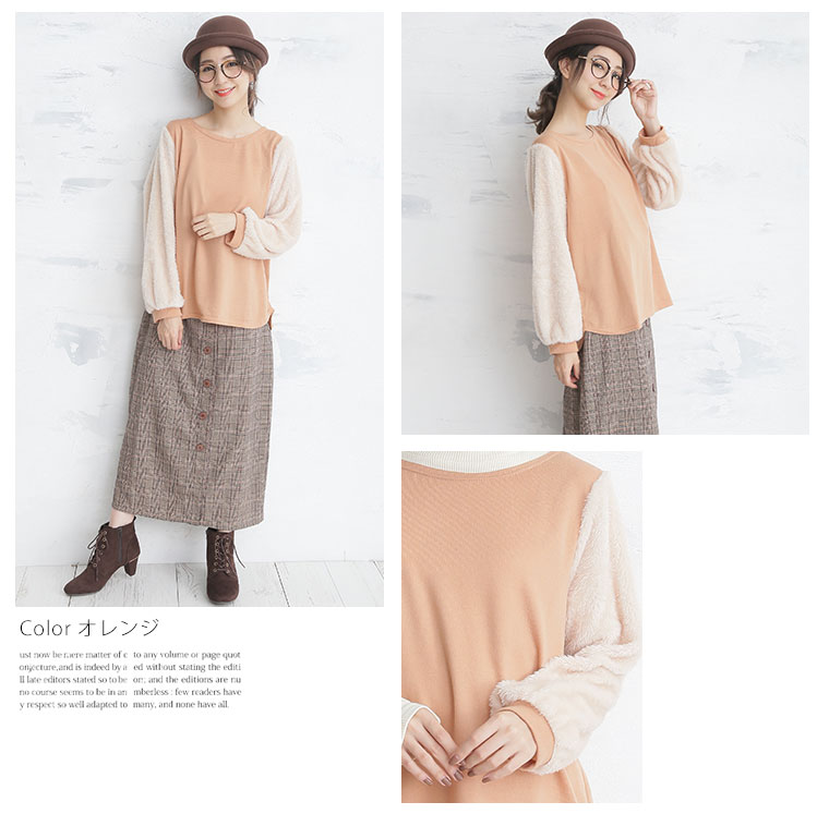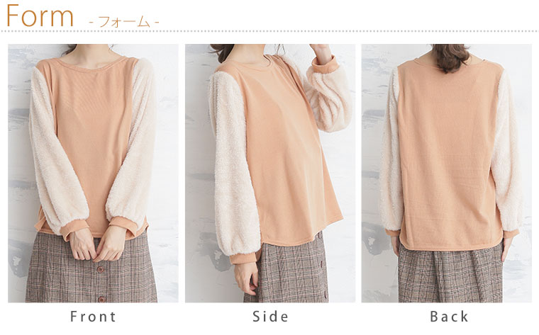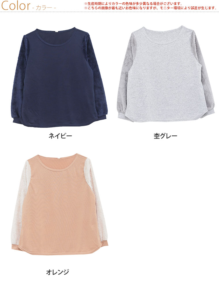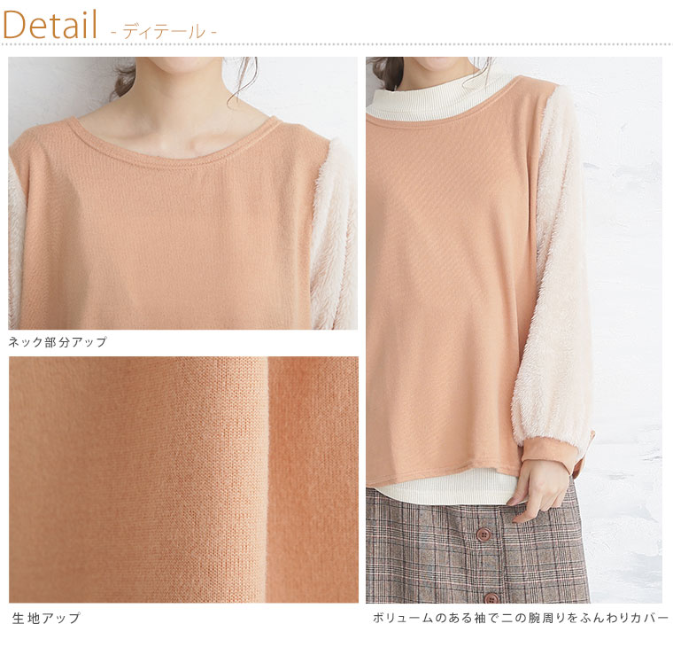 袖がもこもこのファー使いで可愛い。薄起毛ニットソー袖ファー切替長袖プルオーバー