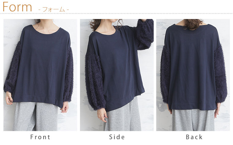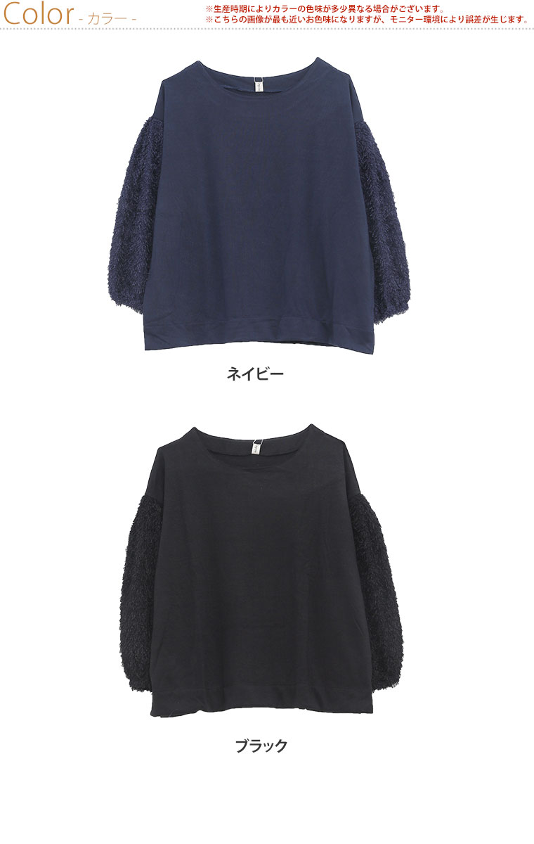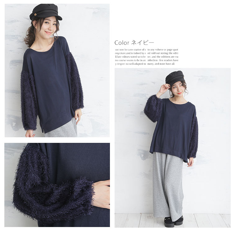 袖がシャギー生地使いでボリュームスリーブが可愛い。薄起毛ニットソー長袖プルオーバー