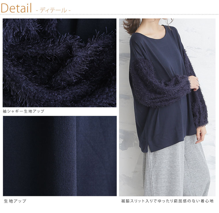 身頃は薄起毛ニットソー素材で伸縮性◎シャギー部分も伸縮するので着心地が良い。
