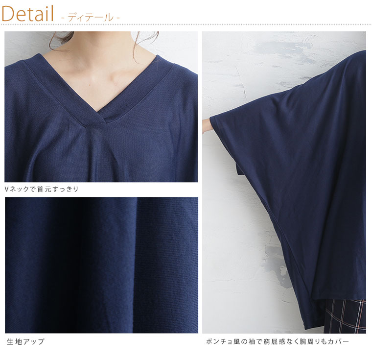Vネックで首元すっきり。ドレープが品のある大人フェミニン感をだしつつ体型をカバーしてくれる。