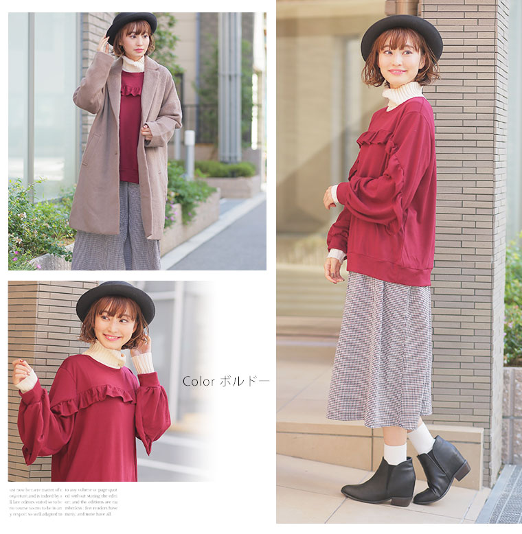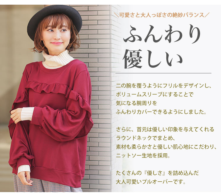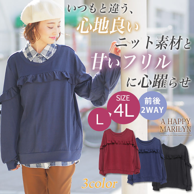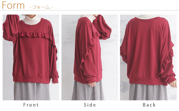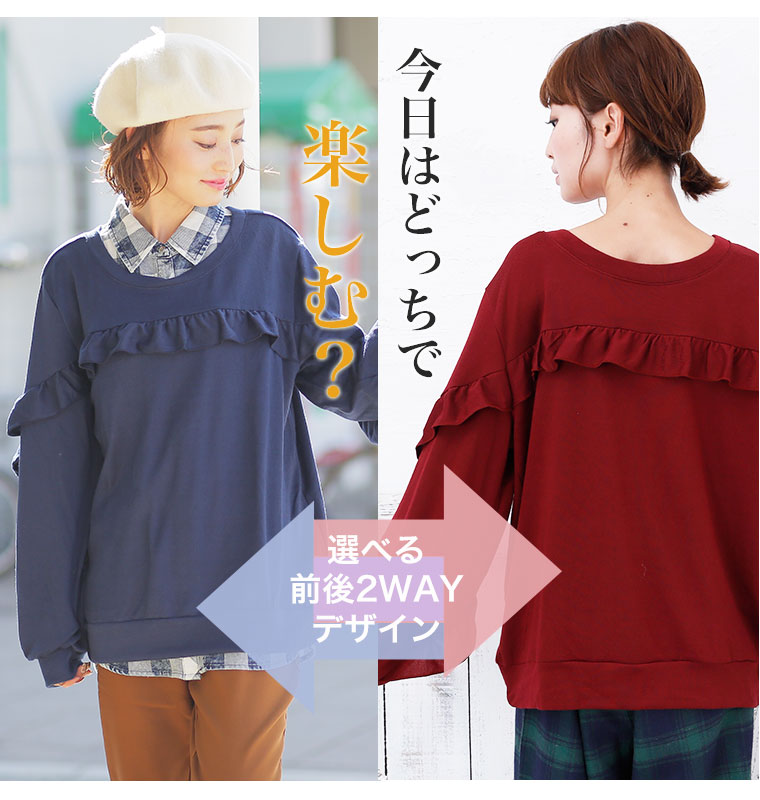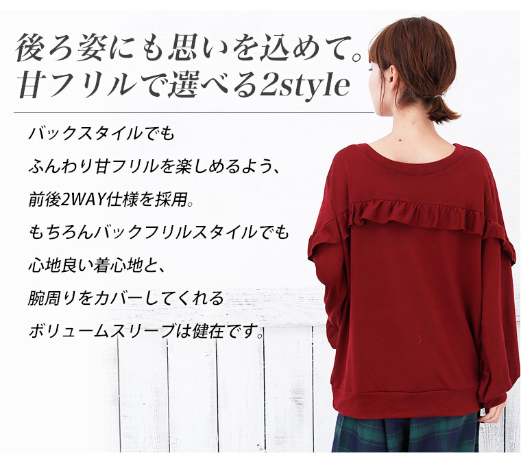 前後どちらでも着られる2WAY仕様。薄起毛ニットソーフリルボリューム長袖プルオーバー