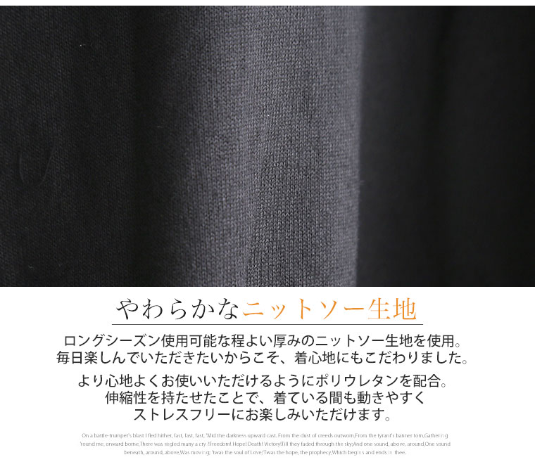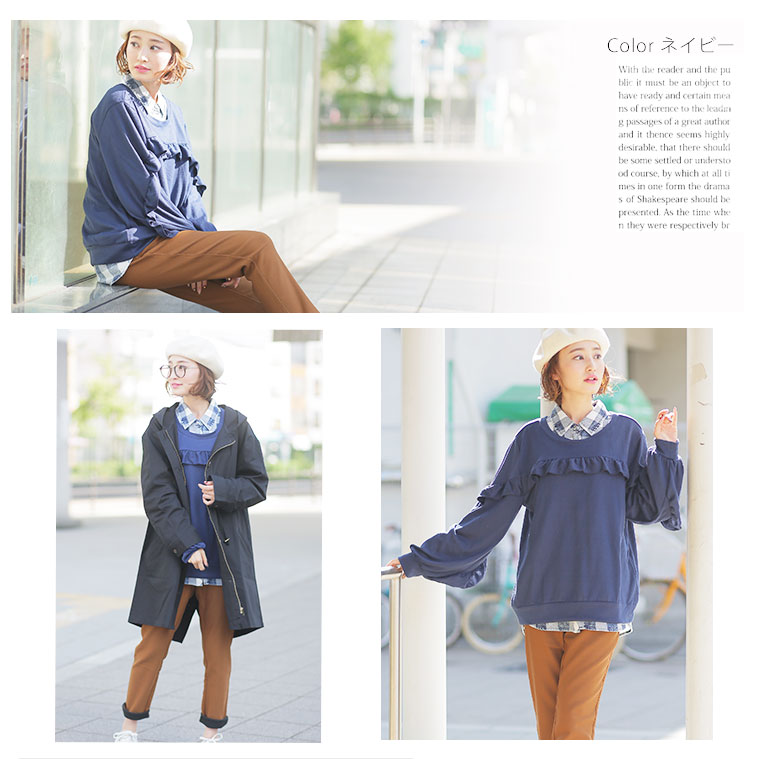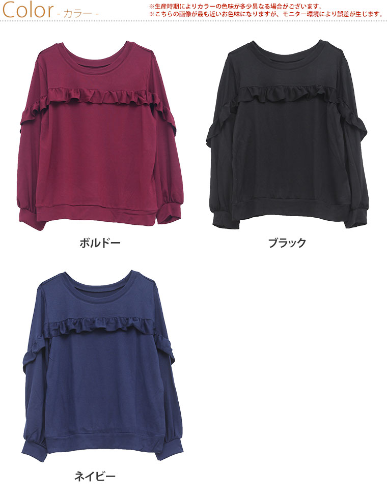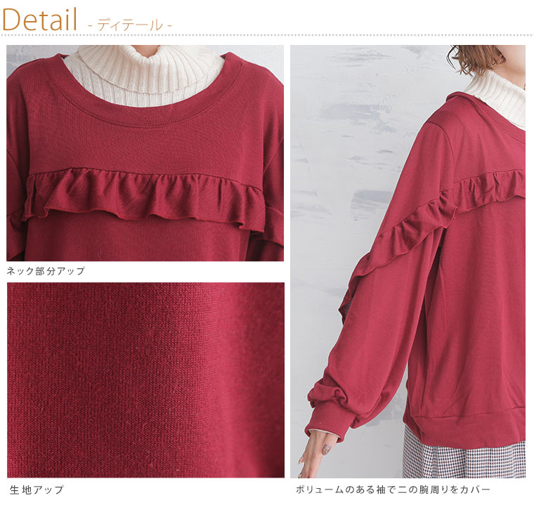 胸から肩にかけてフリルをあしらった女性らしいデザイン。薄起毛ニットソー素材で伸縮性◎