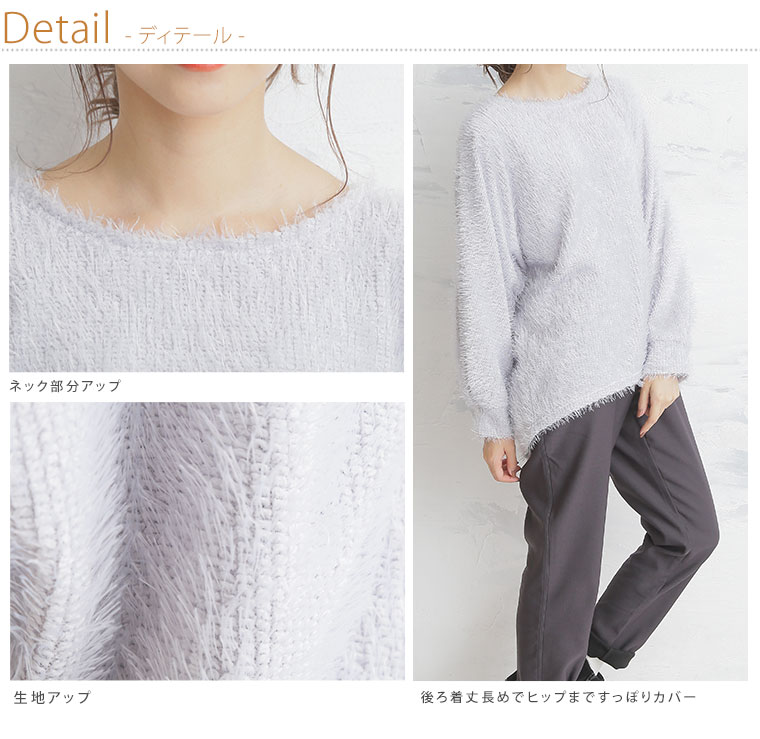 ドルマンスリーブでゆったりとした着心地。伸縮性のあるシャギー素材で窮屈感なく着れる。
