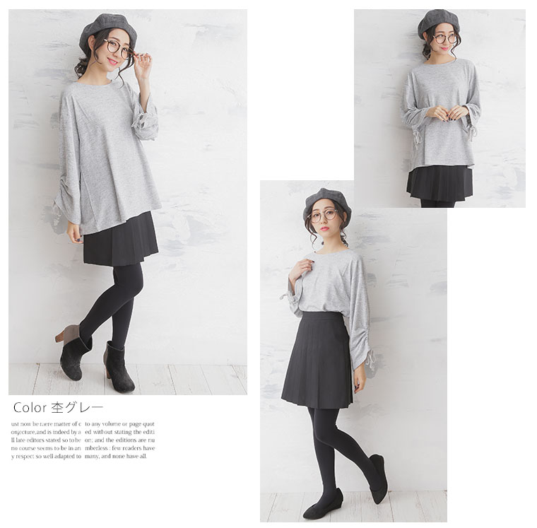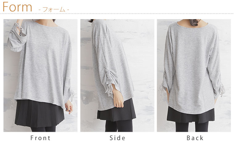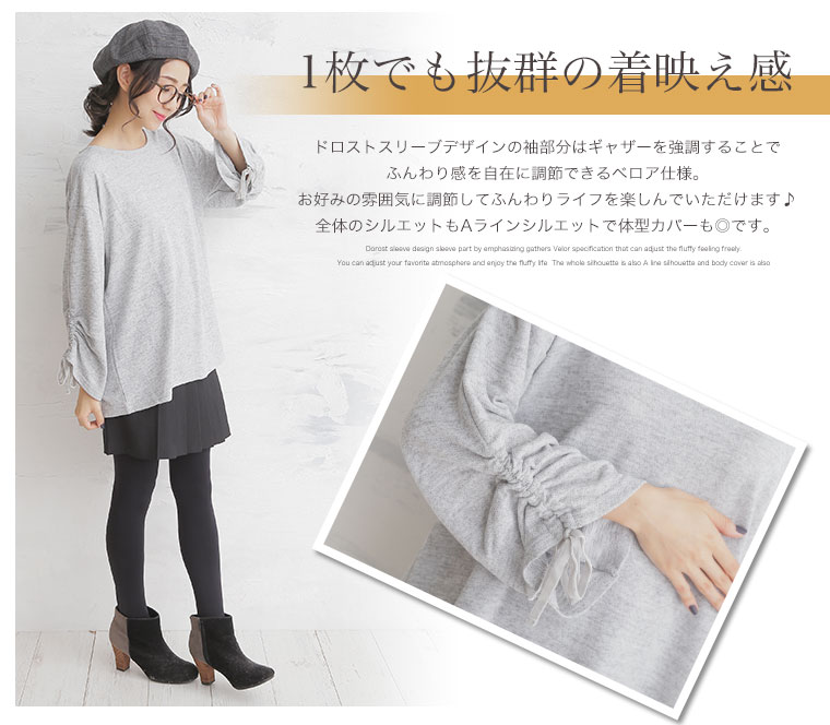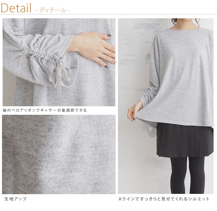 袖のベロアリボンでギャザー分量調節できる。薄起毛ドロストスリーブプルオーバー