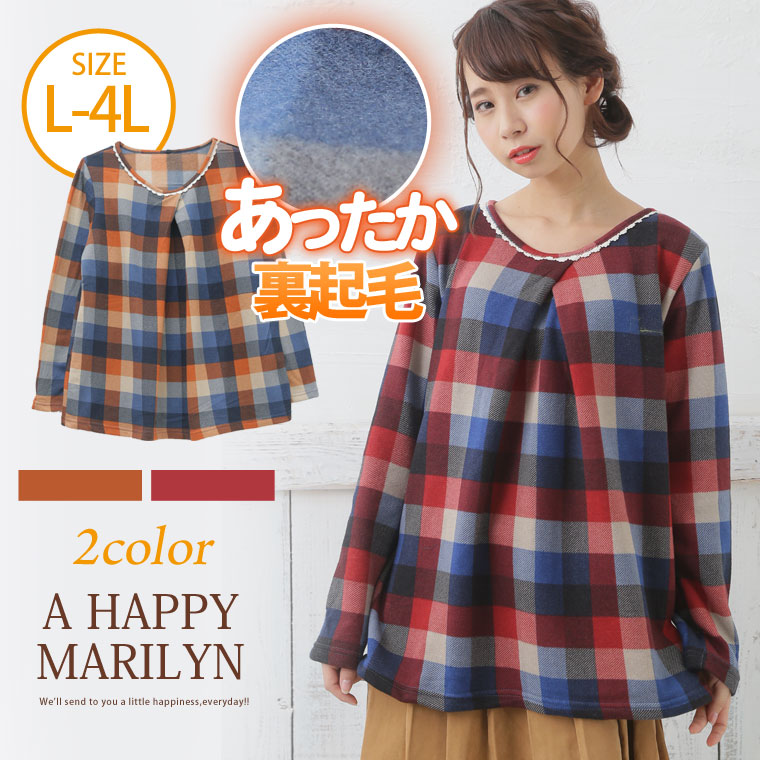 カットソー LL 3L 4L 冬 冬物 冬服 あったか 暖かい 裏シャギー 起毛 ぽっちゃり かわいい おしゃれ カジュアル ナチュラル 可愛い 大人 ビッグサイズ 裏起毛 チェック フロントタック 長袖 プルオーバー