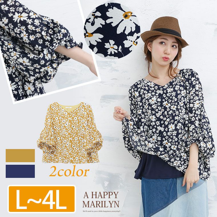 シャツ ブラウス 花柄 LL 3L 4L 春 春物 春服 夏 夏物 夏服 ゆったり かわいい おしゃれ 袖コンシャス マーガレット プリント 七分袖 リボン バルーン スリーブ プルオーバー | 大きいサイズの通販ならハッピーマリリン