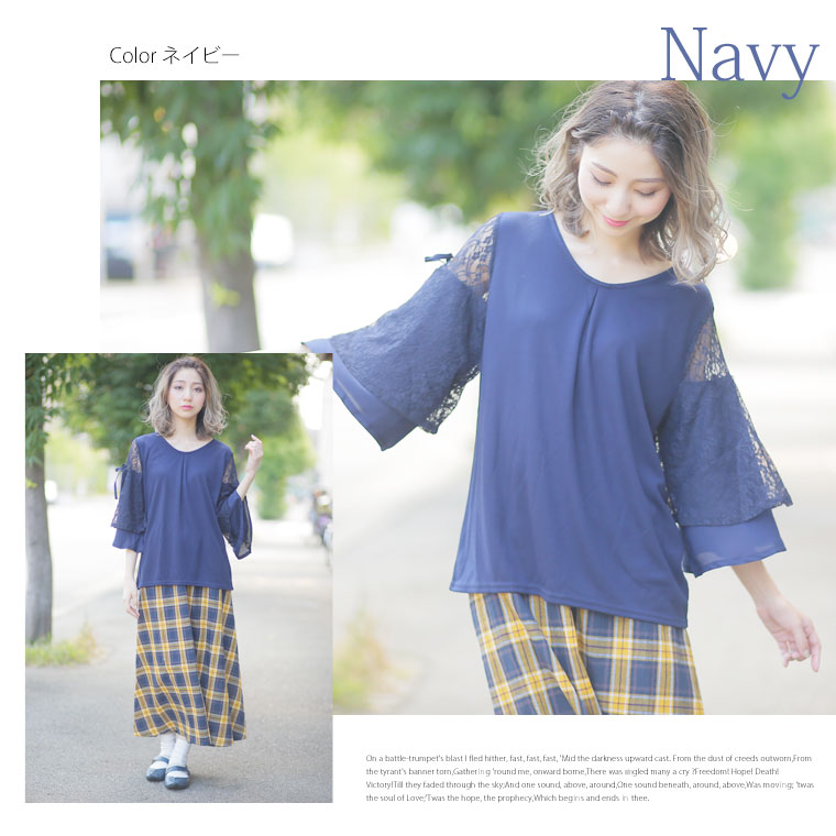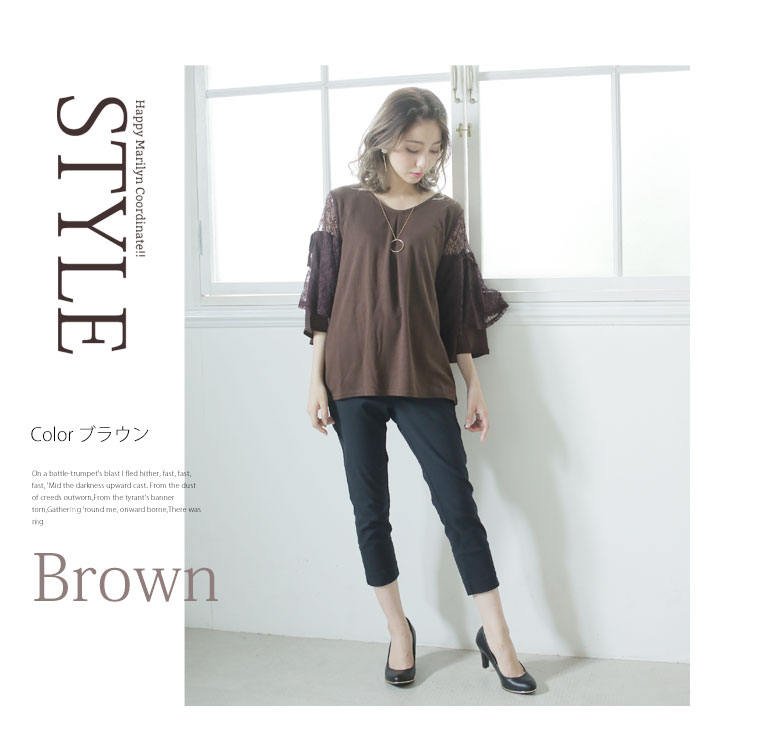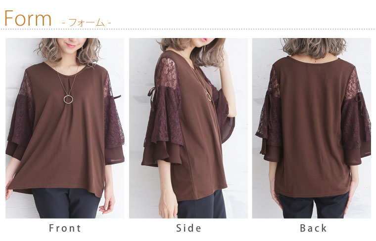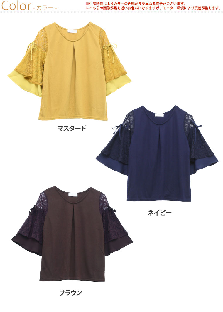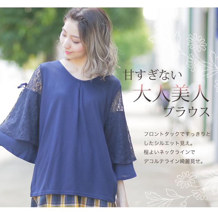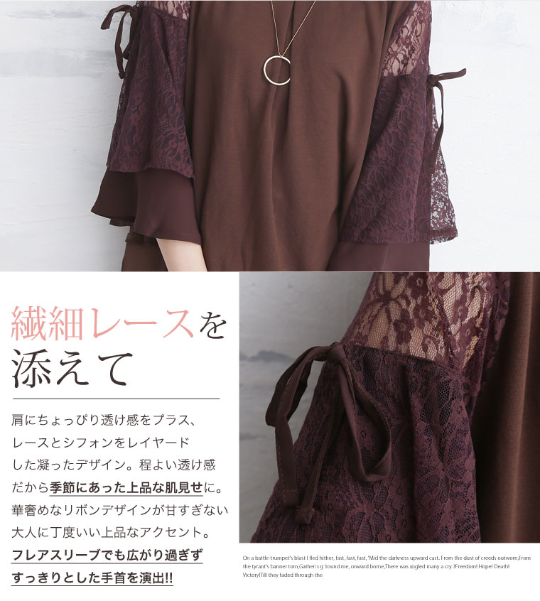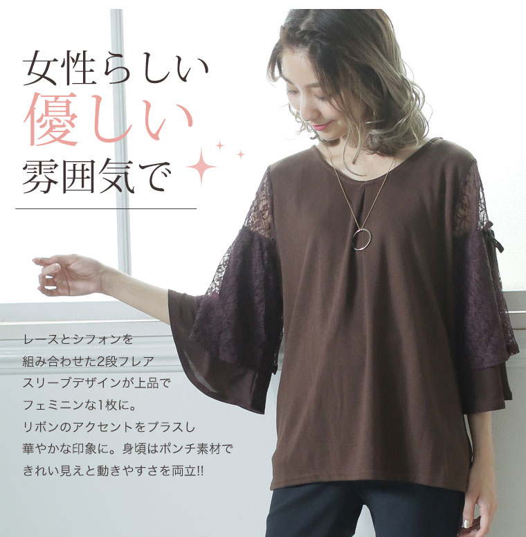 袖口フレアで女性らしい着こなしに。肩レースがアクセントの1枚。