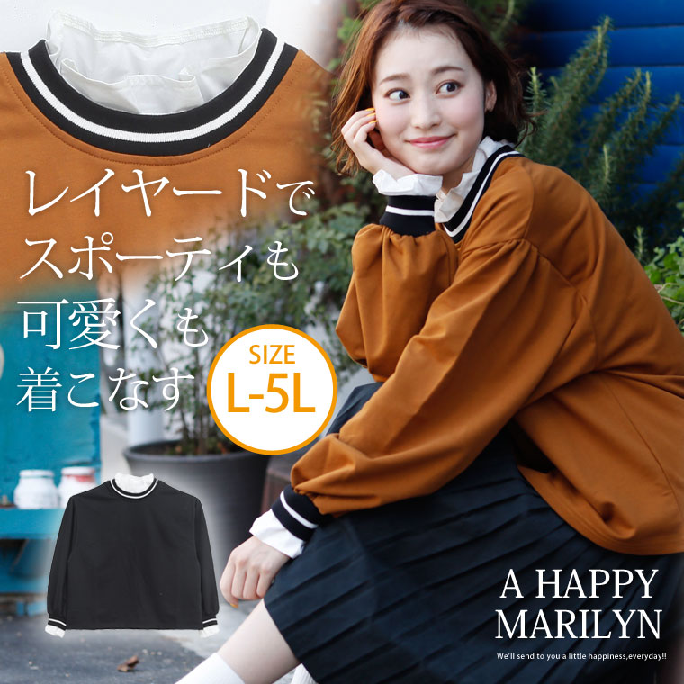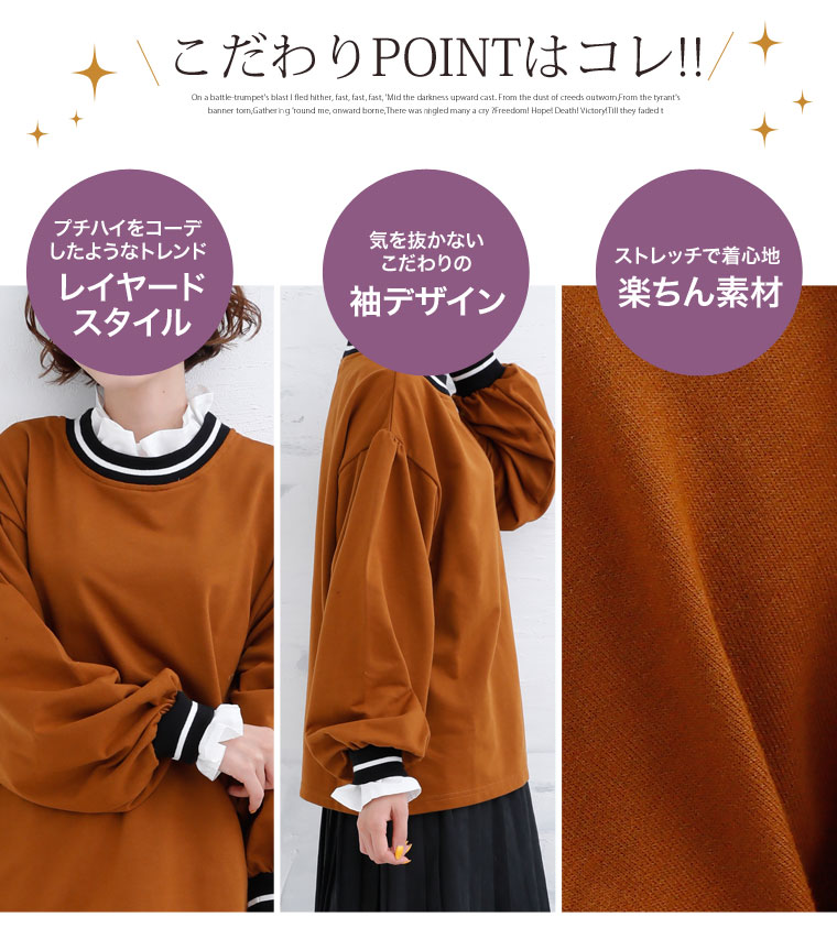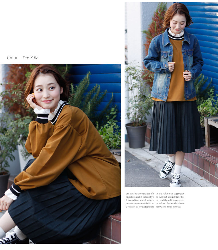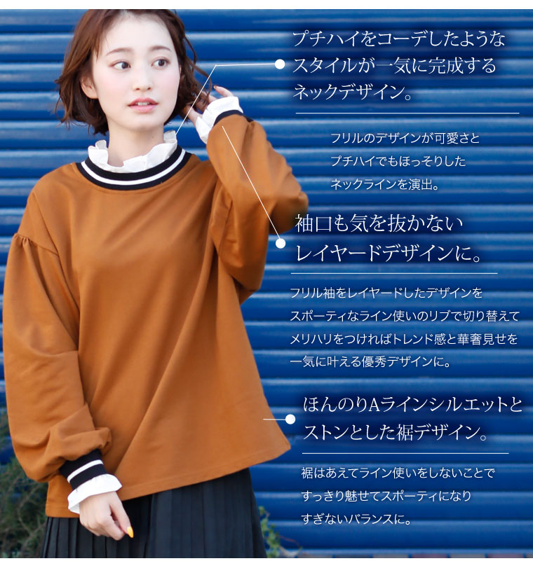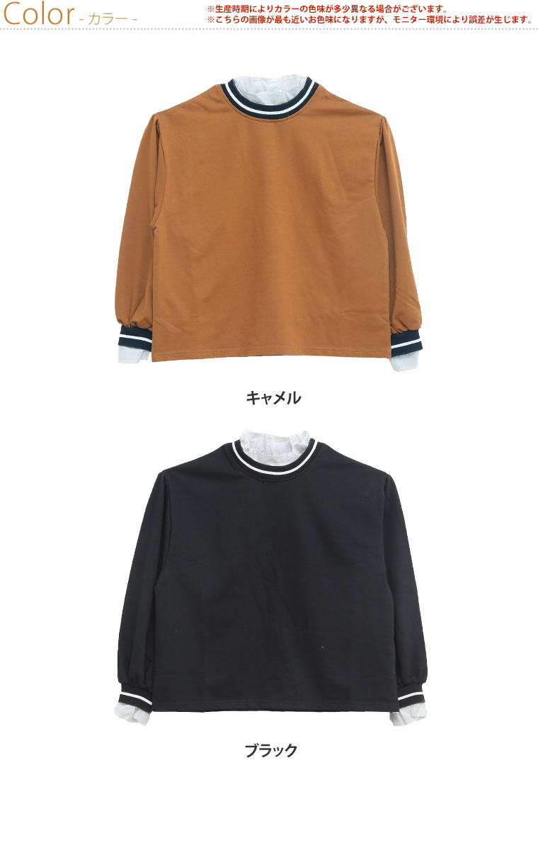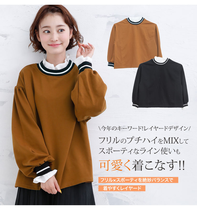 襟・袖口に添えた白フリルが女性らしいアクセント。フェイクレイヤードトップス
