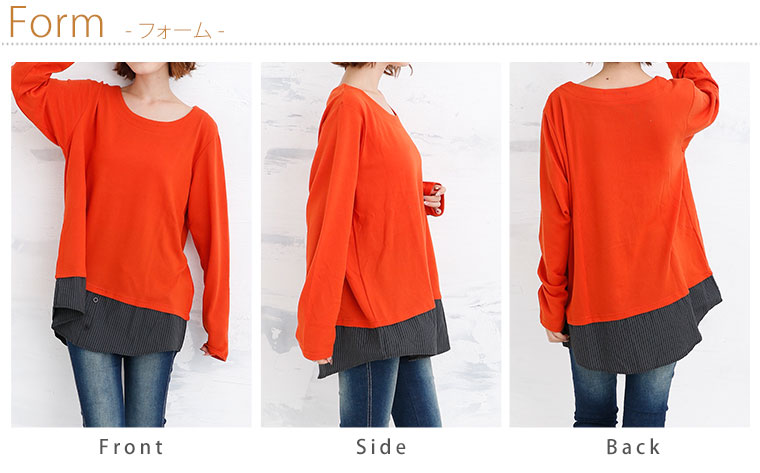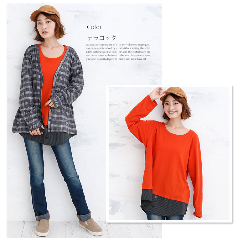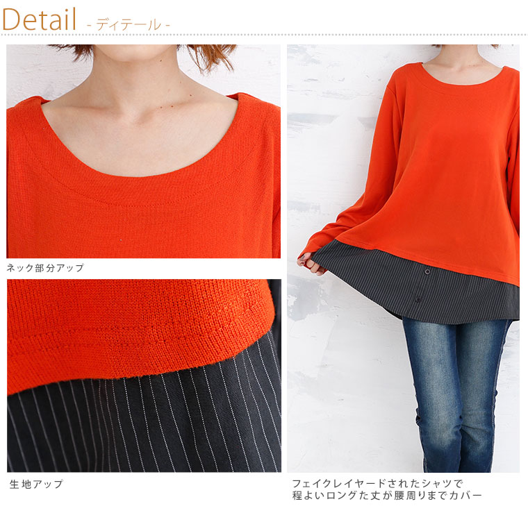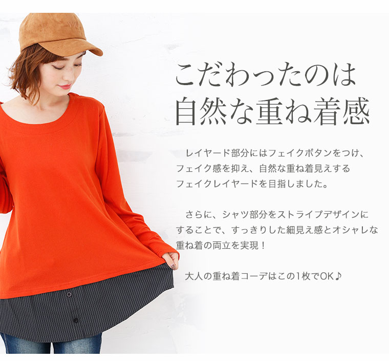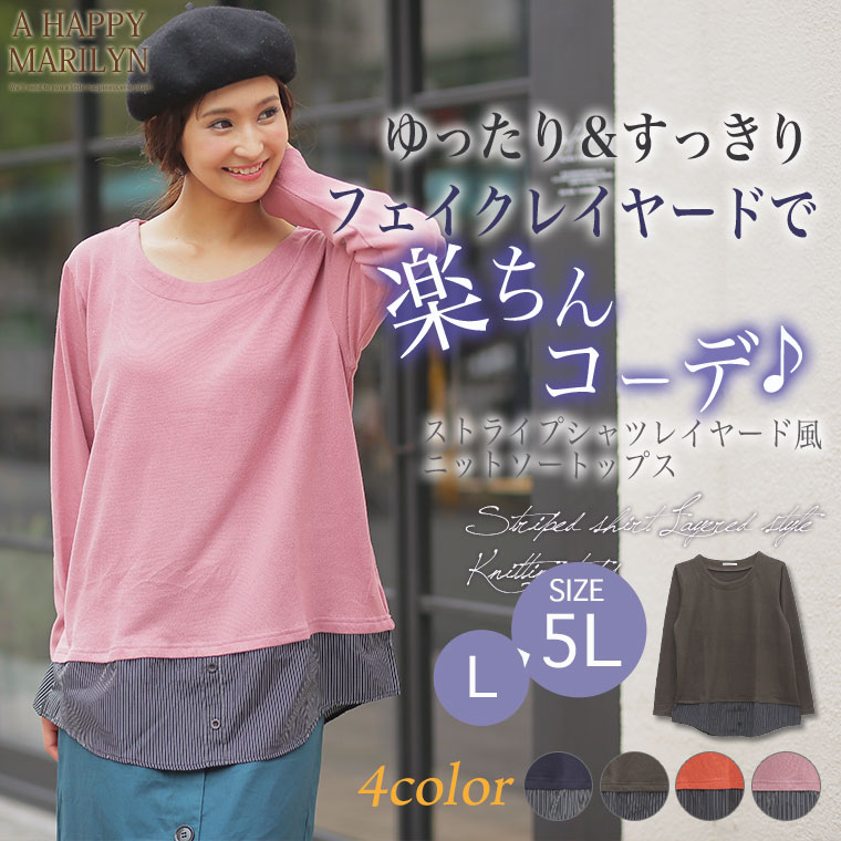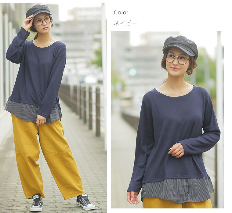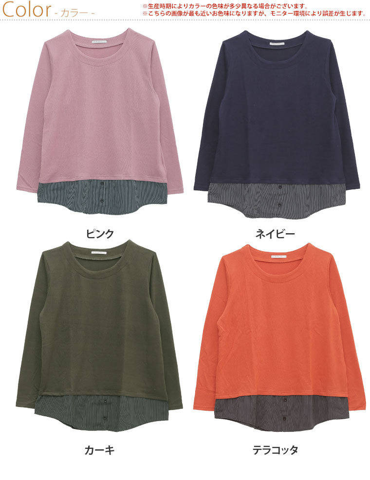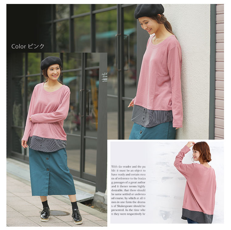1枚で楽ちんオシャレコーデ♪裾ストライプシャツレイヤード風長袖ニットソートップス