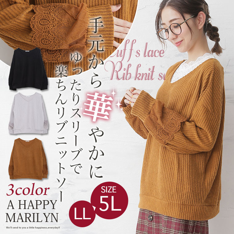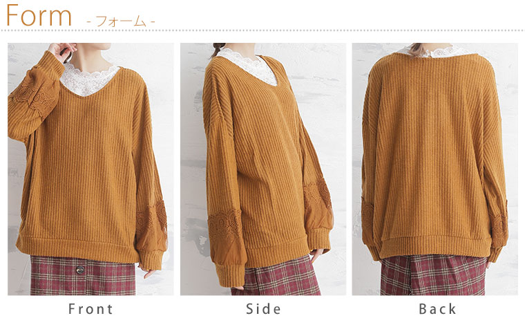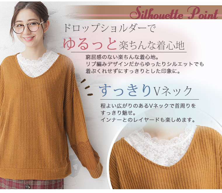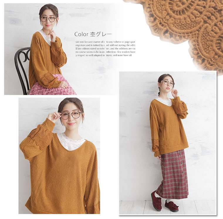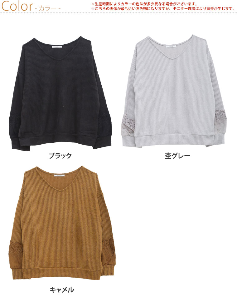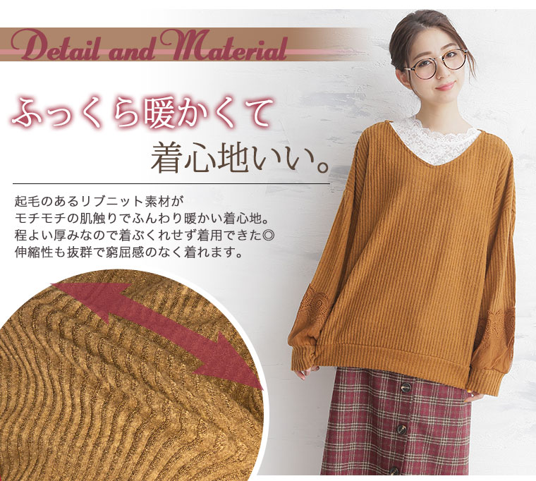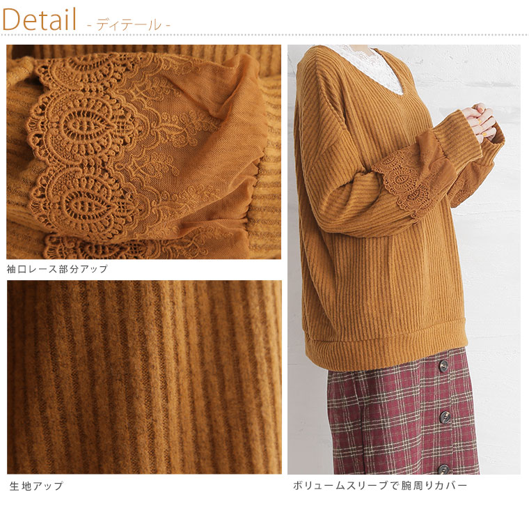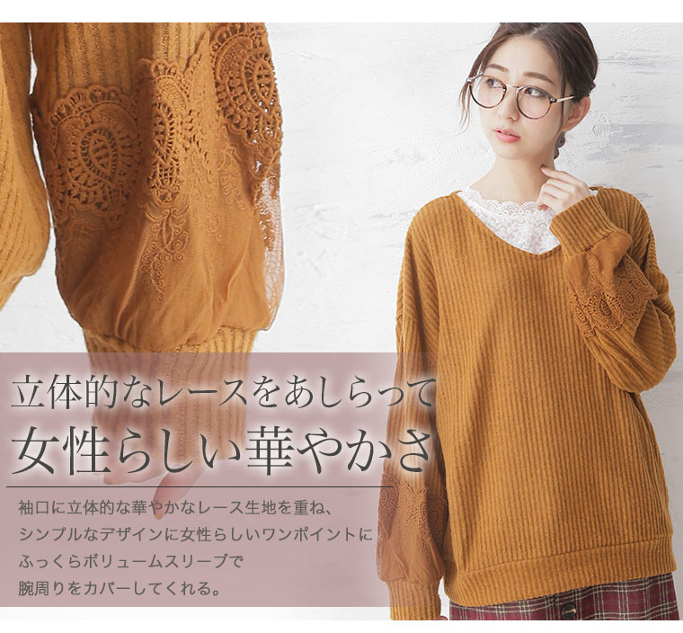袖口に立体的なレースをあしらって華やかに。起毛リブ長袖ニットソープルオーバー