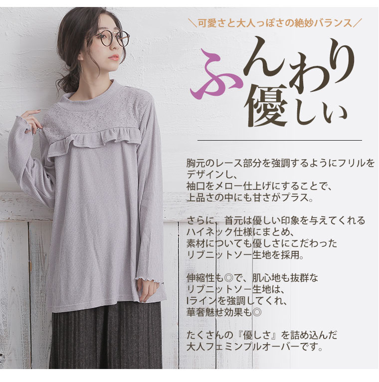 胸元のレースとフリルで上品な印象に。リブニットソーハイネック長袖プルオーバー