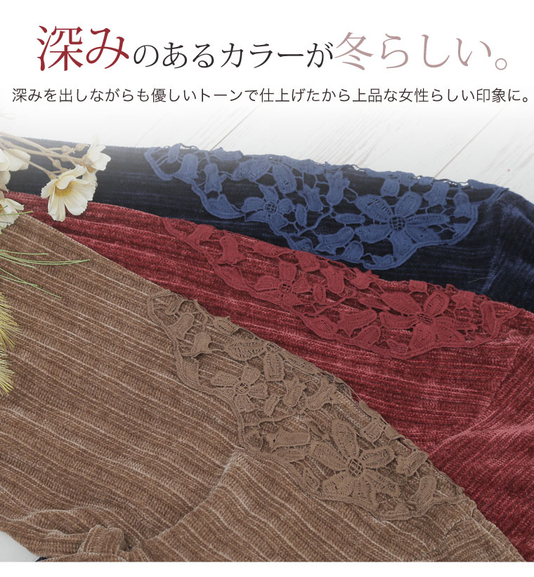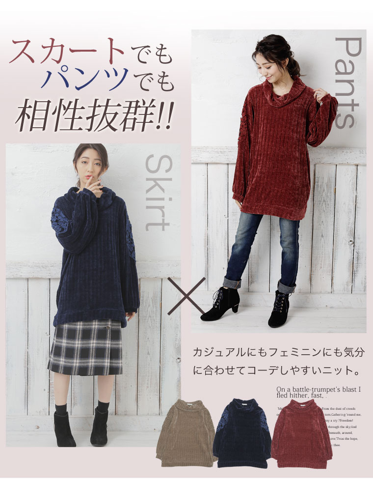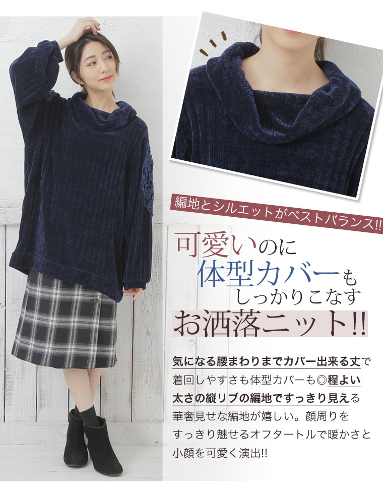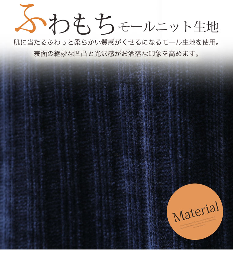 ちょっぴり光沢感のあるモールニット生地でフェミニンな印象に。長め着丈で腰回りしっかりカバー◎
