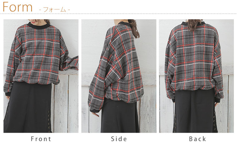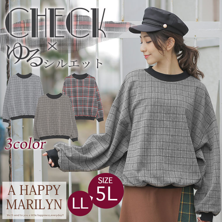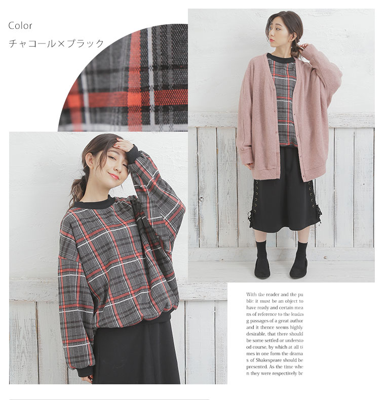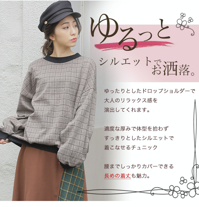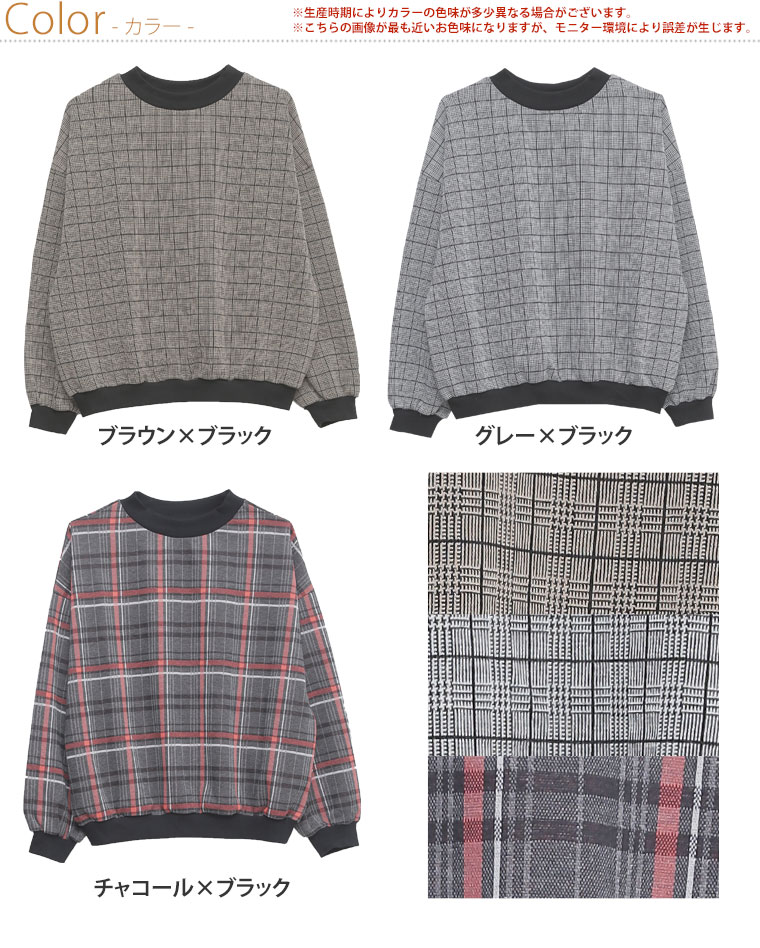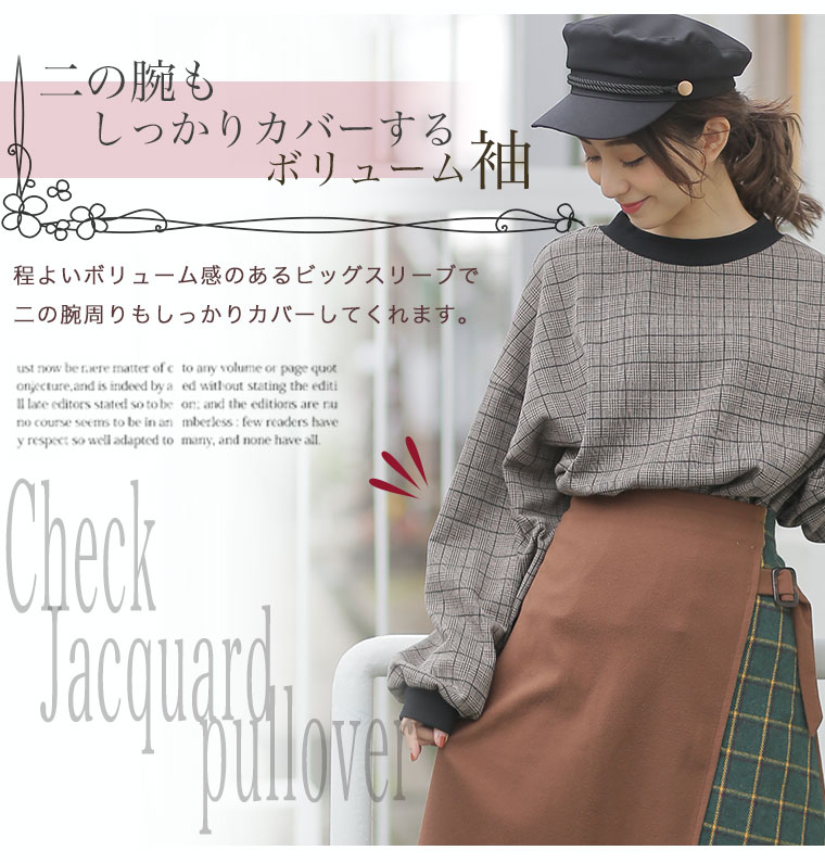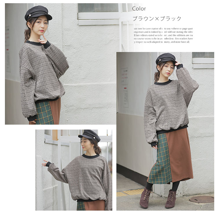 配色リブ切替えでふんわり体型カバーしてくれる。チェックカットジャガード長袖プルオーバー