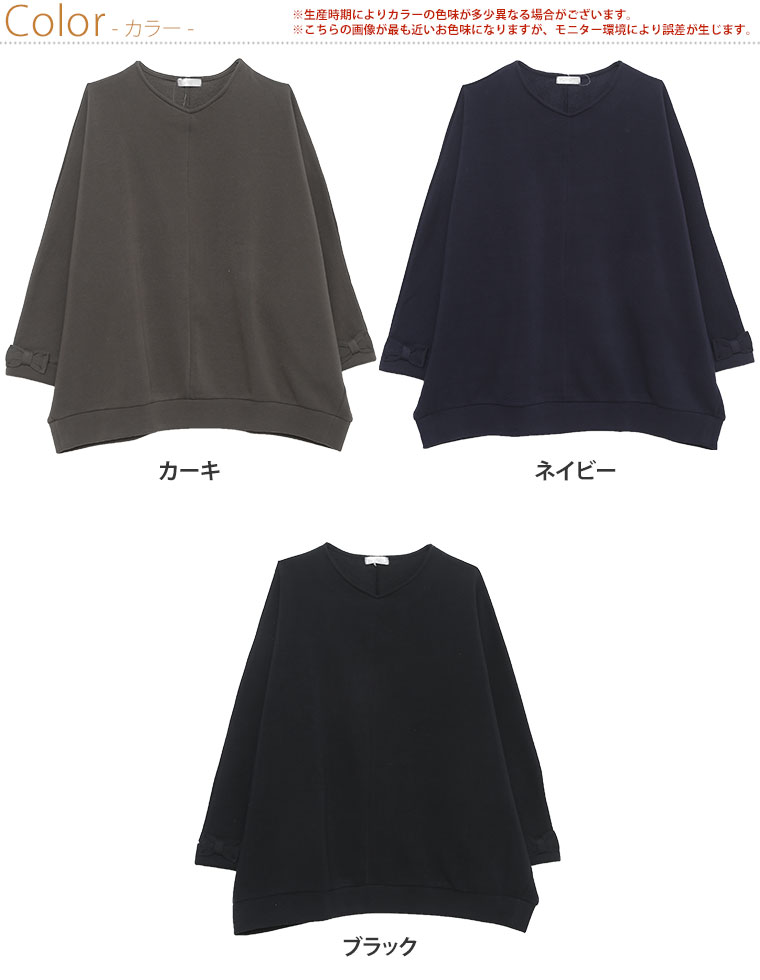 3. 大きいサイズ 裾口 リボン モチーフ 裏起毛 Vネック プルオーバー