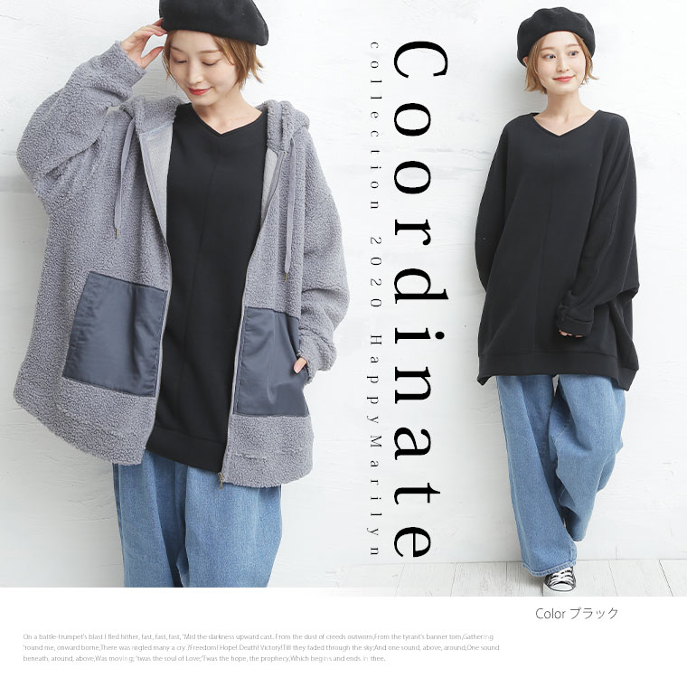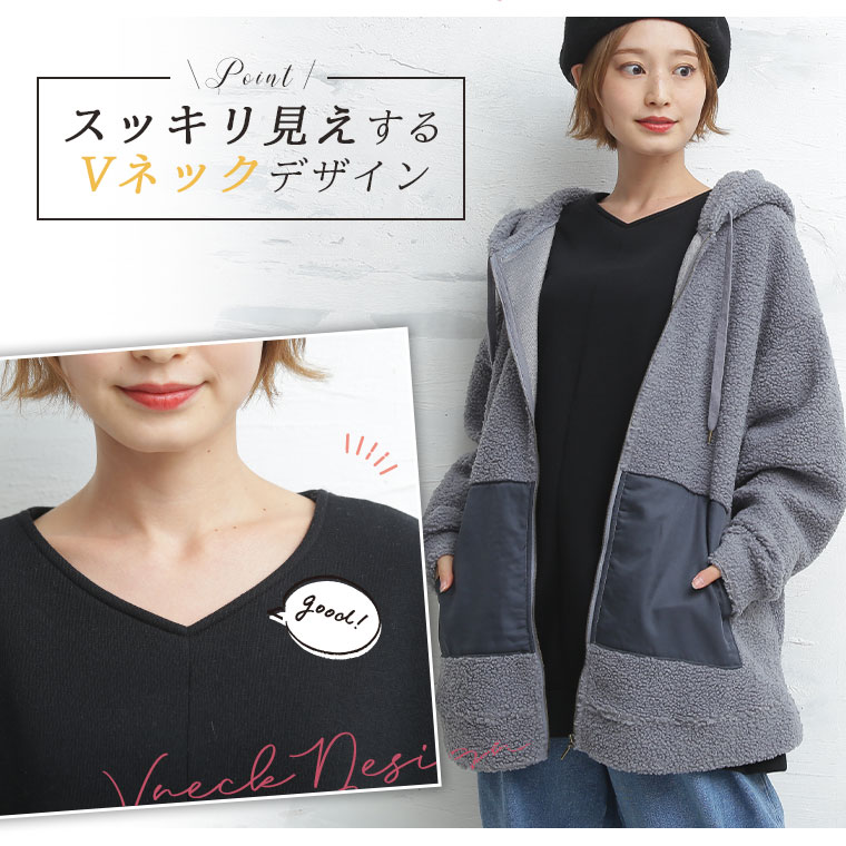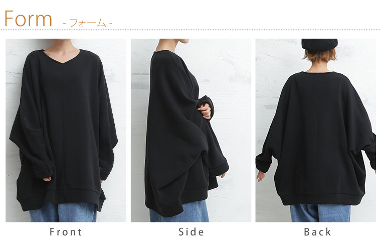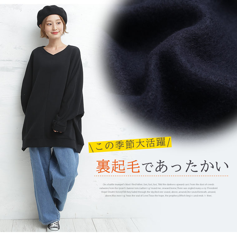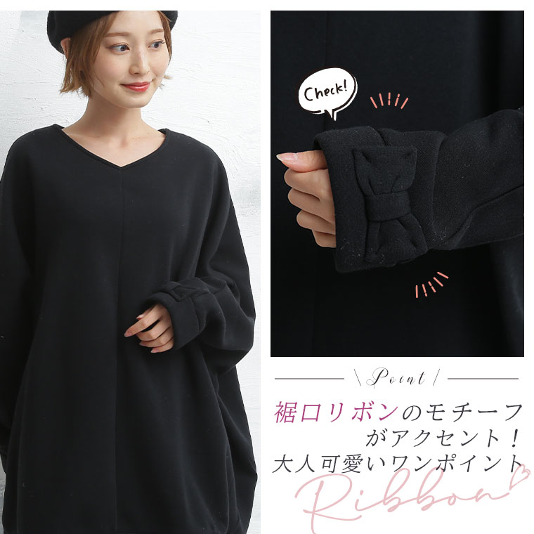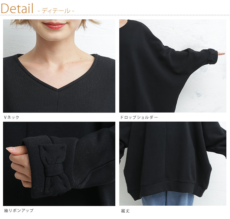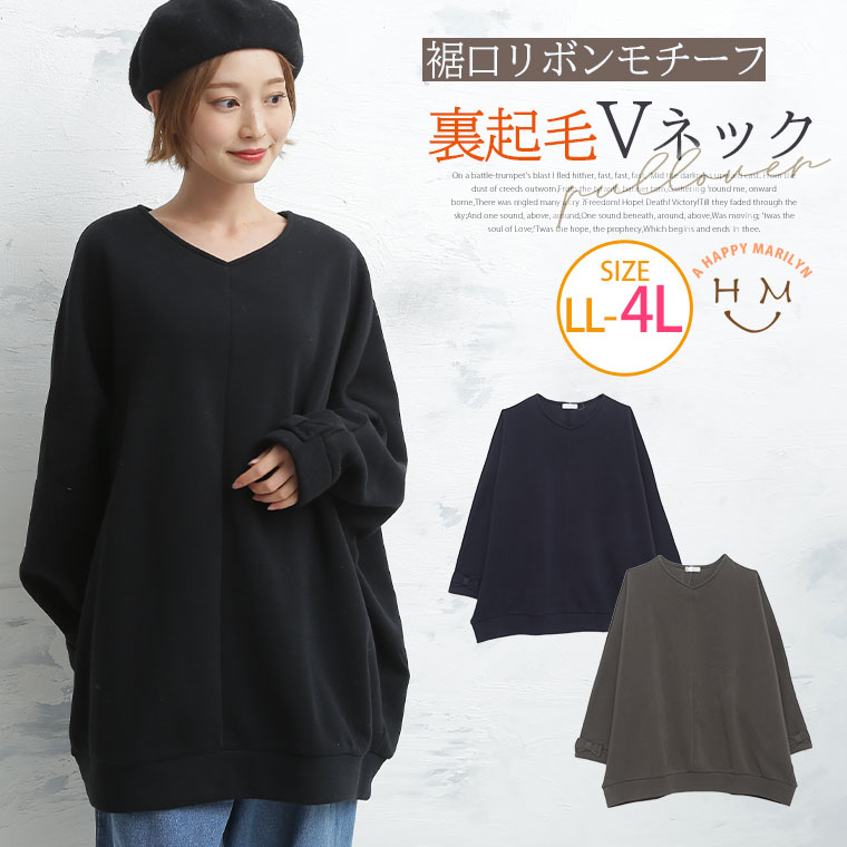 4. 大きいサイズ 裾口 リボン モチーフ 裏起毛 Vネック プルオーバー