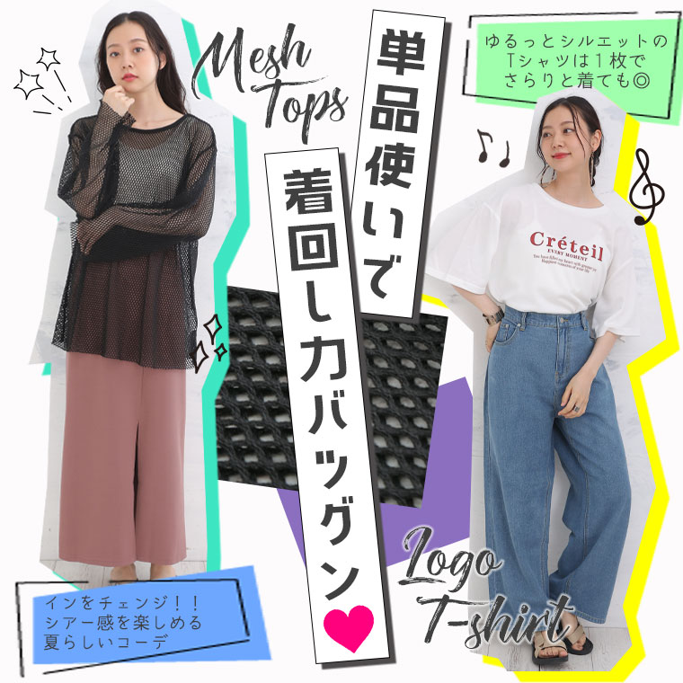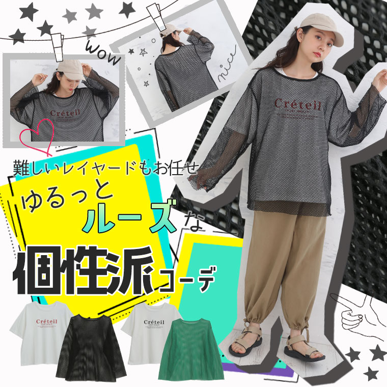 シンプルなTシャツもメッシュトップスをプラスすれば一気にこなれ感UP!