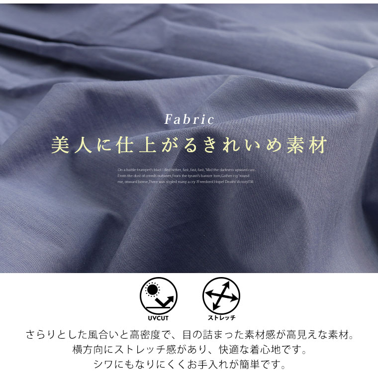とても綺麗なブルーで素敵です。タックがついているので着心地も楽で綺麗に見えるので気に入っています。