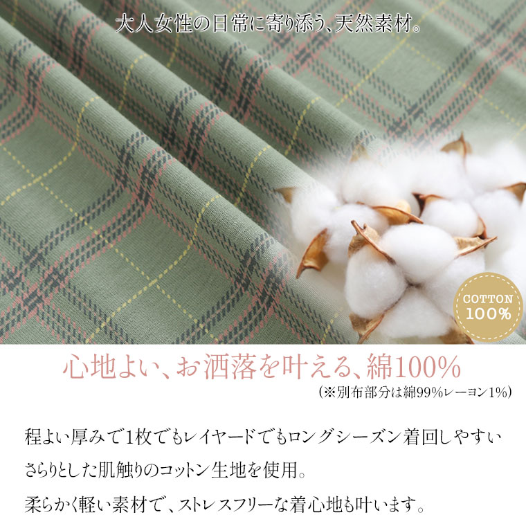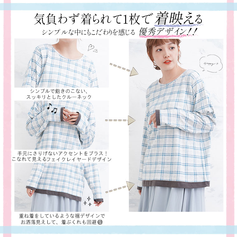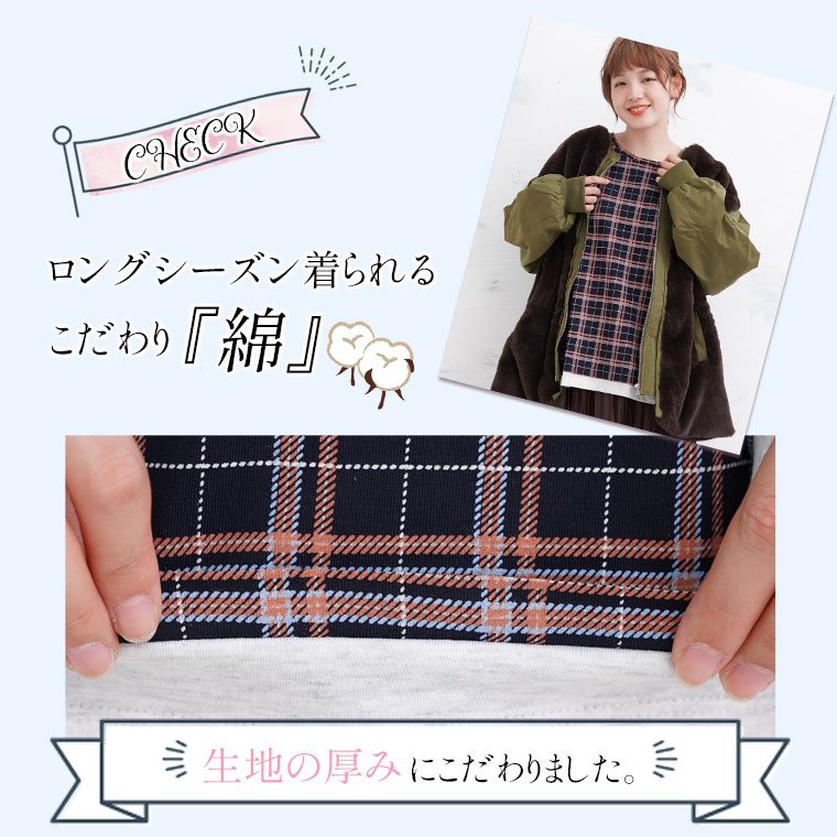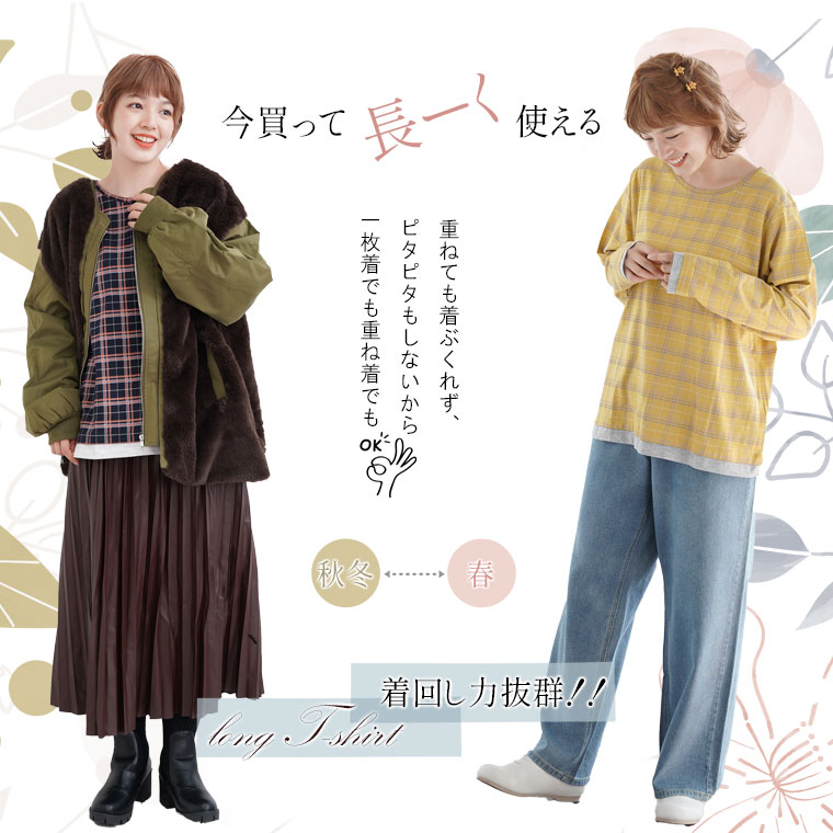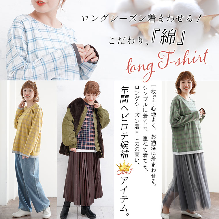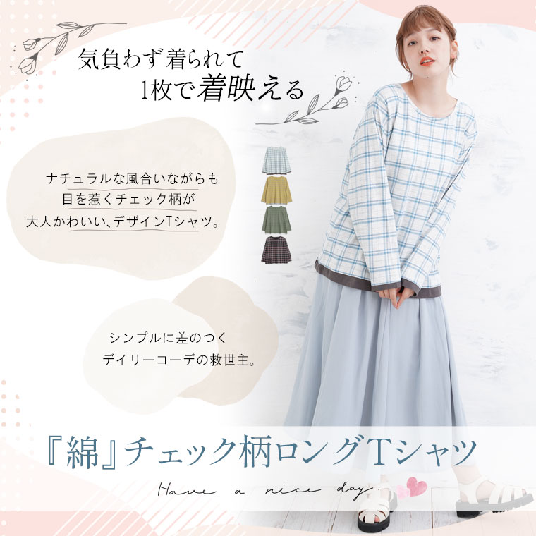 ナチュラルな風合いながらも目を惹くチェック柄が大人かわいい、デザインロングTシャツ。