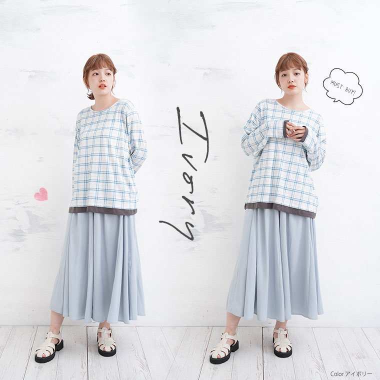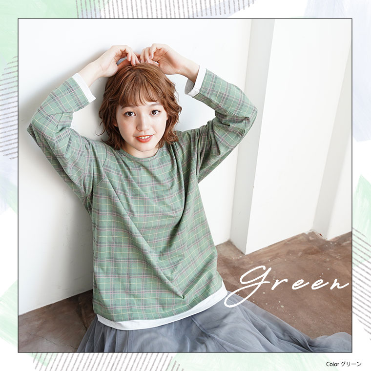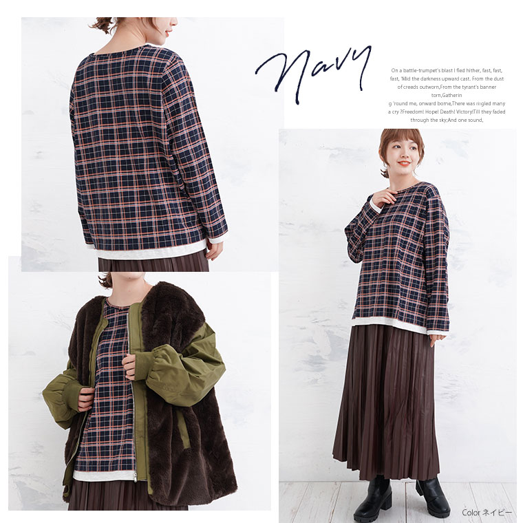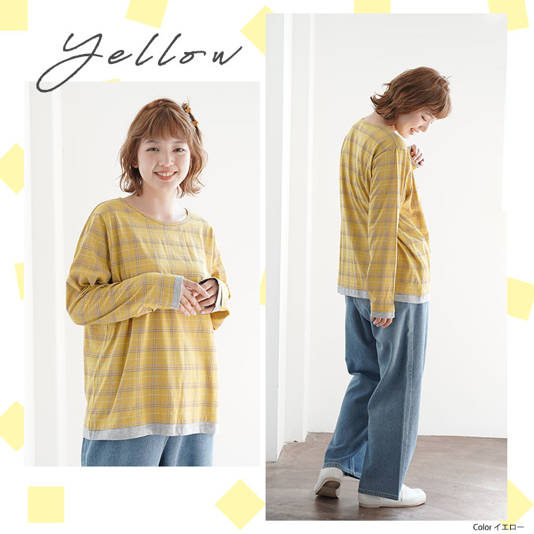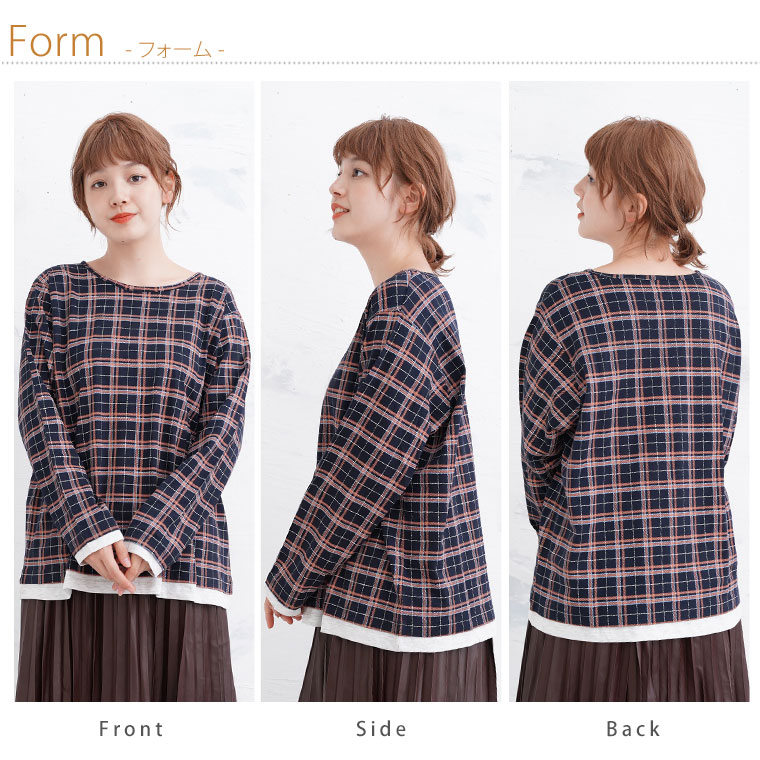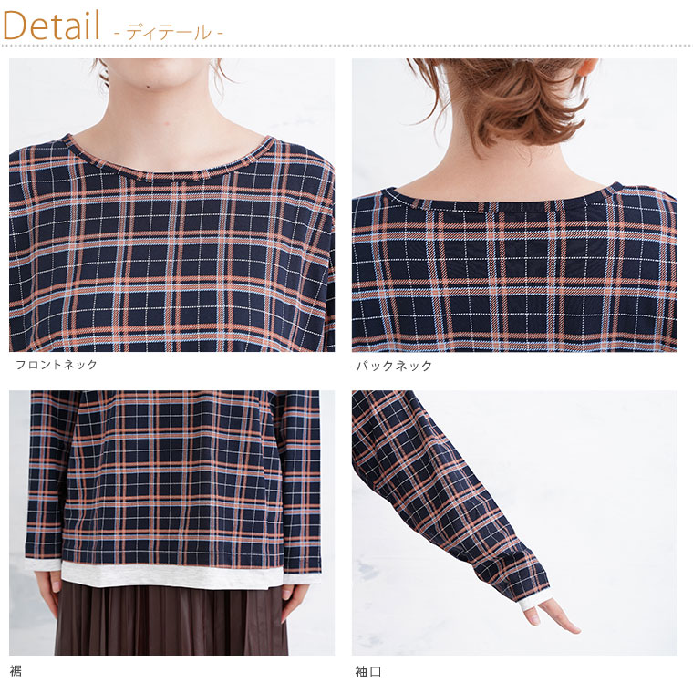 ナチュラルな風合いながらも目を惹くチェック柄が大人かわいい、デザインロングTシャツ。