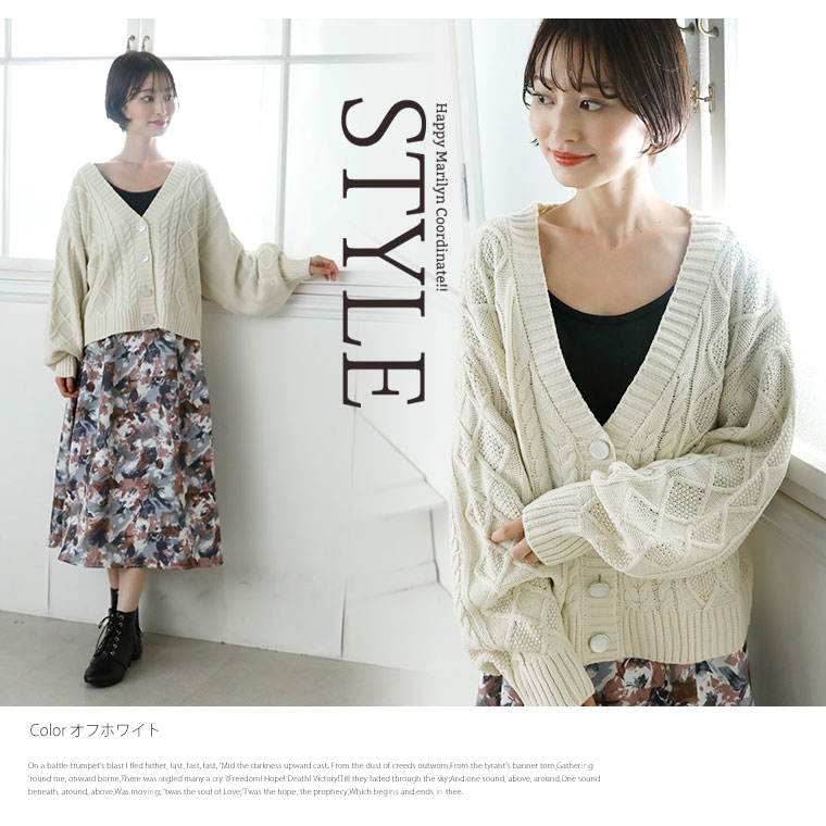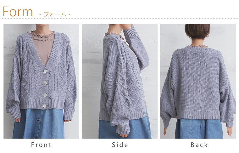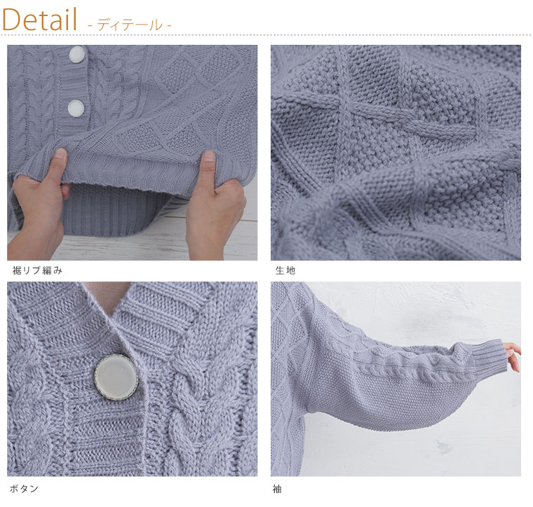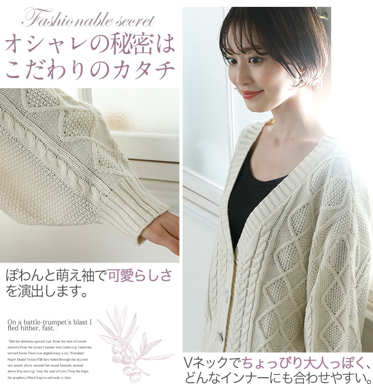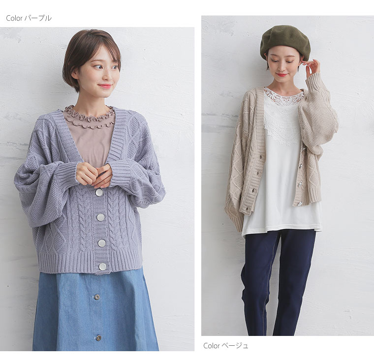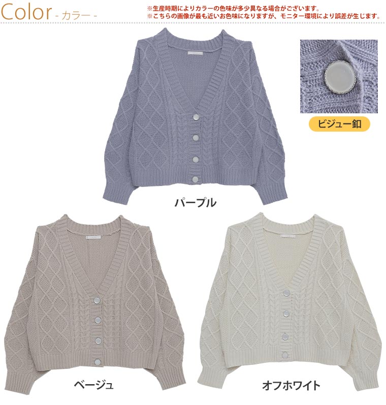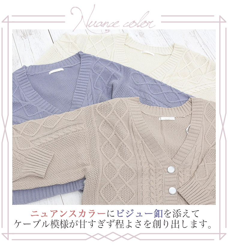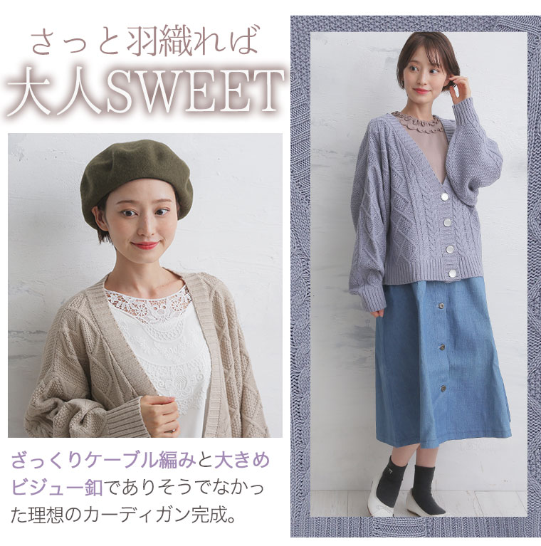 ケーブル編みと大きめビジューボタンがかわいいカーディガン