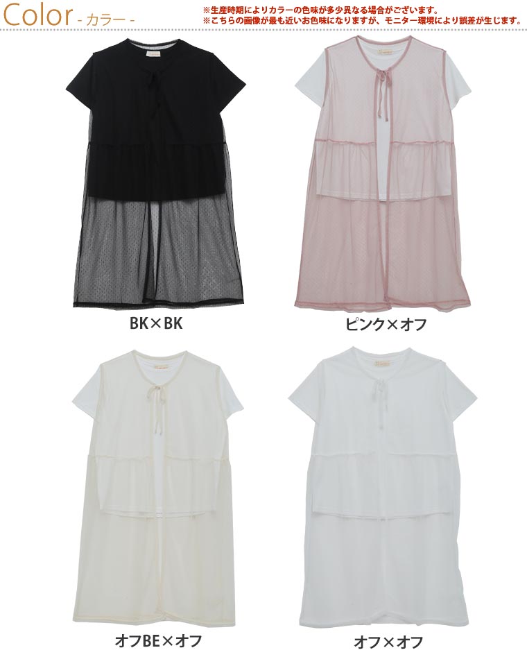 トップス アンサンブル レイヤード セット LL 3L 4L 5L 6L 夏 夏物 夏服 夏用 ゆったり 胸周り お尻 腰周り 半袖 かわいい ドットチュール トッパー × Tシャツ アンサンブル