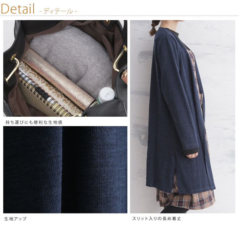 柔らかなニットソー素材でほっこりスタイル。スリット入りトッパーカーデ