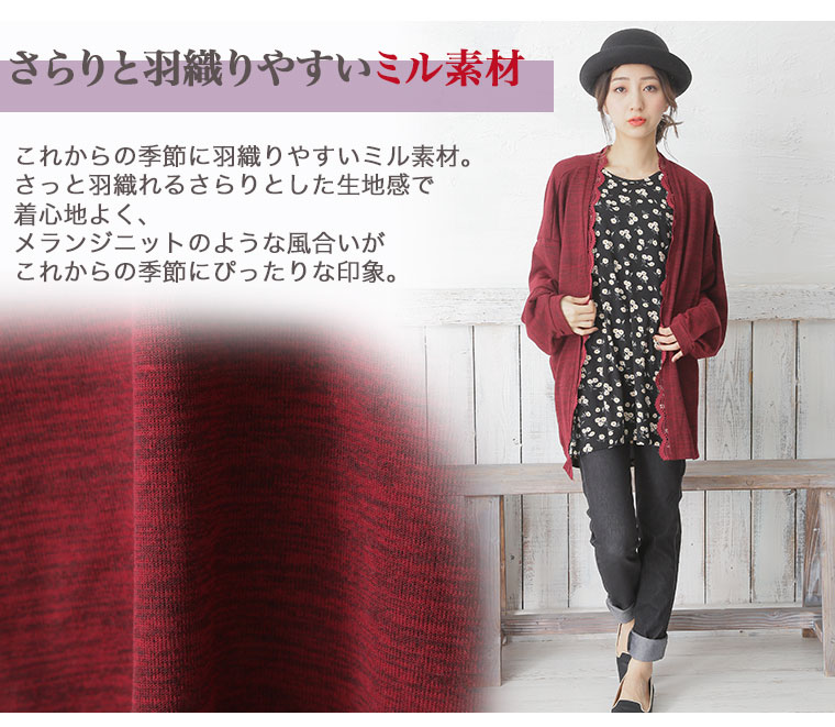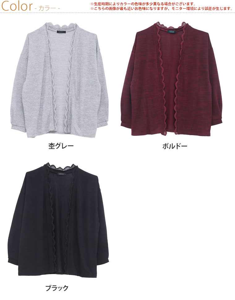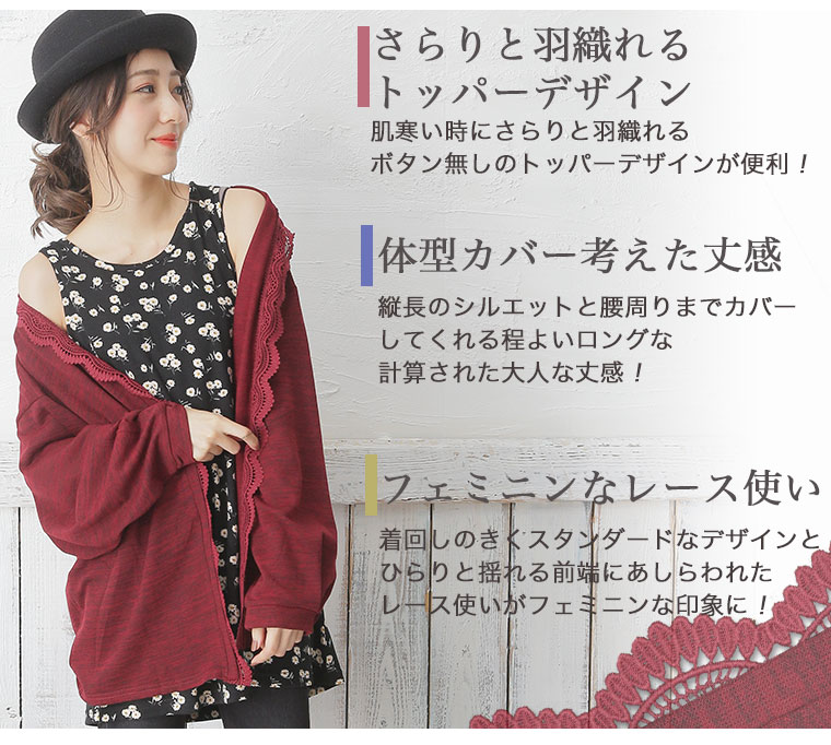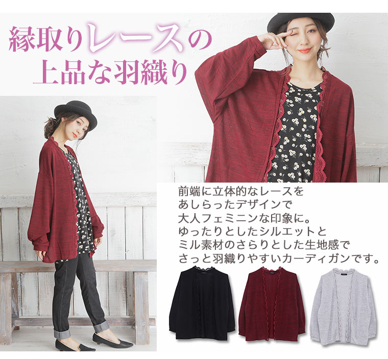 前端に立体的なレースをあしらってフェミニンに。ミル素材長袖トッパーカーディガン