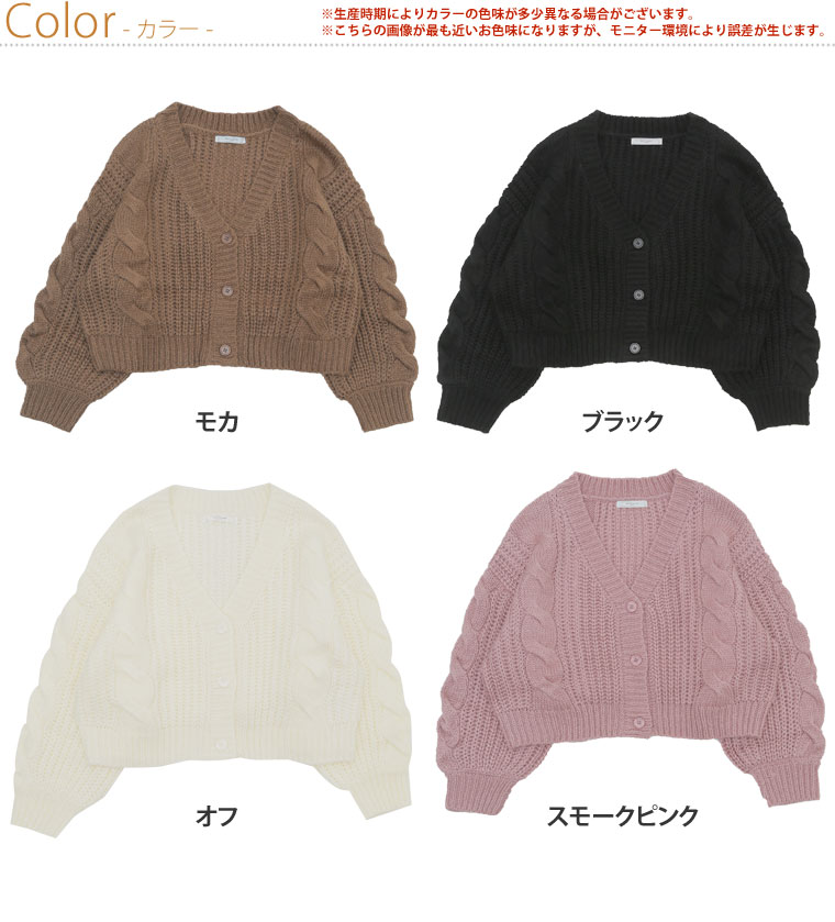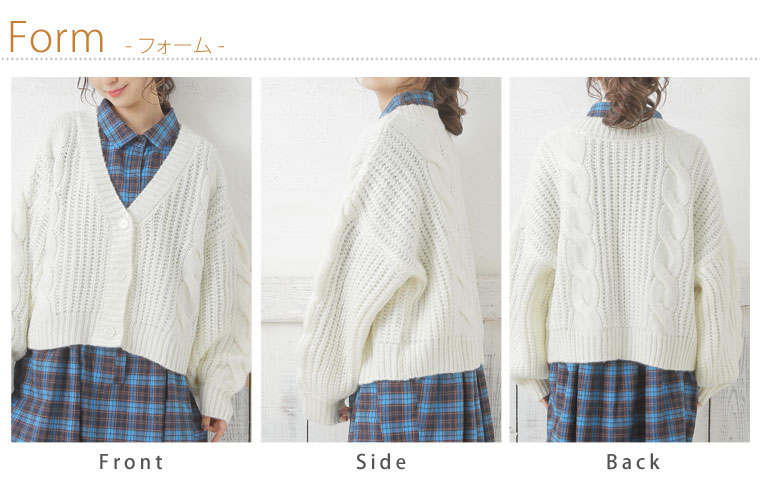 ざっくり編みとケーブル編みが可愛いカーデでいいですね。袖丈は手首から13cmの長さがあり、丈は短めで腰ぐらいでした。スカートに合わせると可愛いと感じました。