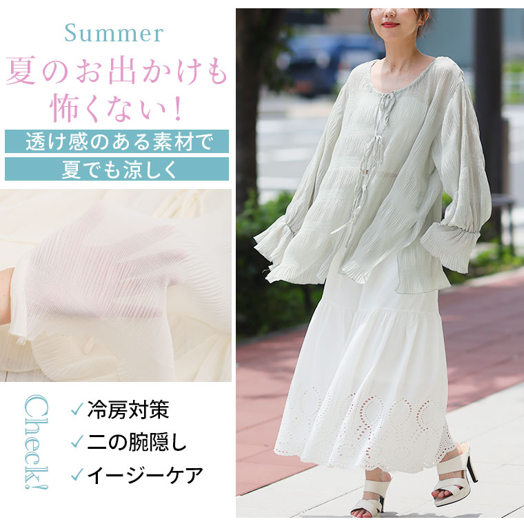 ■着用感:ややゆったり、■着丈:お尻まですっぽり、■バスト:ややゆったり、■腕回り:ややゆったり、■袖口:ゆったり、■袖丈:長袖、■首回り:ちょうどいい、■ウエスト:-、■ヒップ:-、■太もも:- ●透け感のあるさらっとした涼しい生地感で、夏に嬉しいです。体型を拾わず身体のラインをきれいに隠してくれるのが嬉しいですね◎