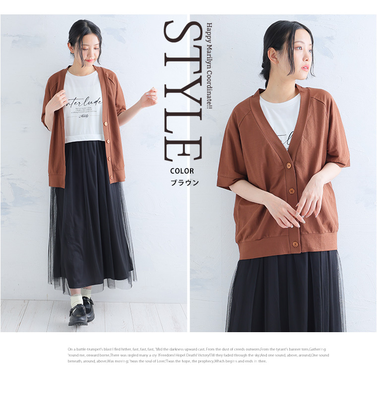 軽くてコンパクトなので、冷房対策として持ち運びにも最適です。カーゴパンツで辛めに、ボリュームスカートで甘めスタイルなど、ボトム次第で違った印象が楽しめます