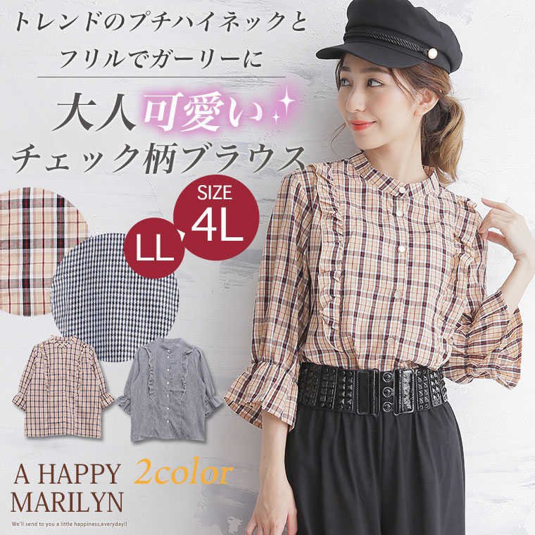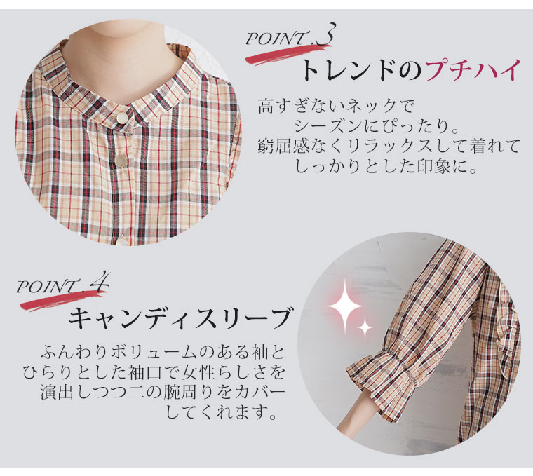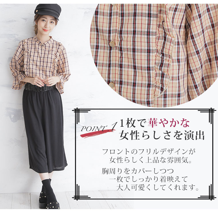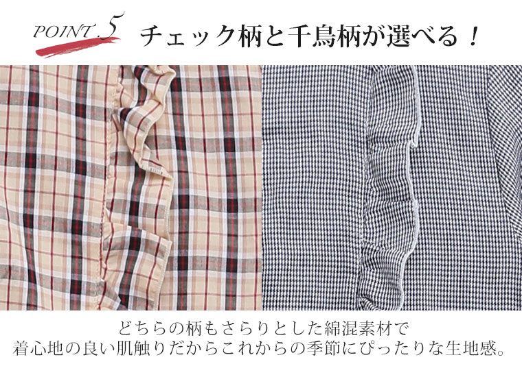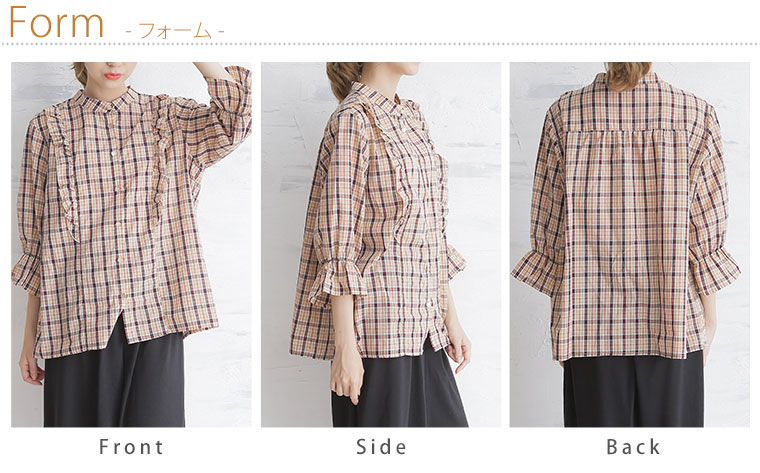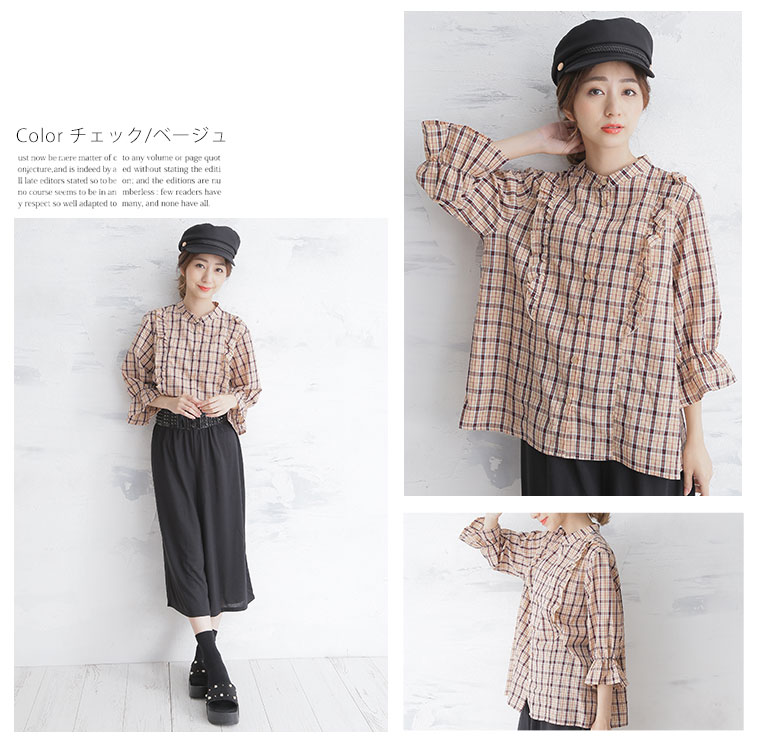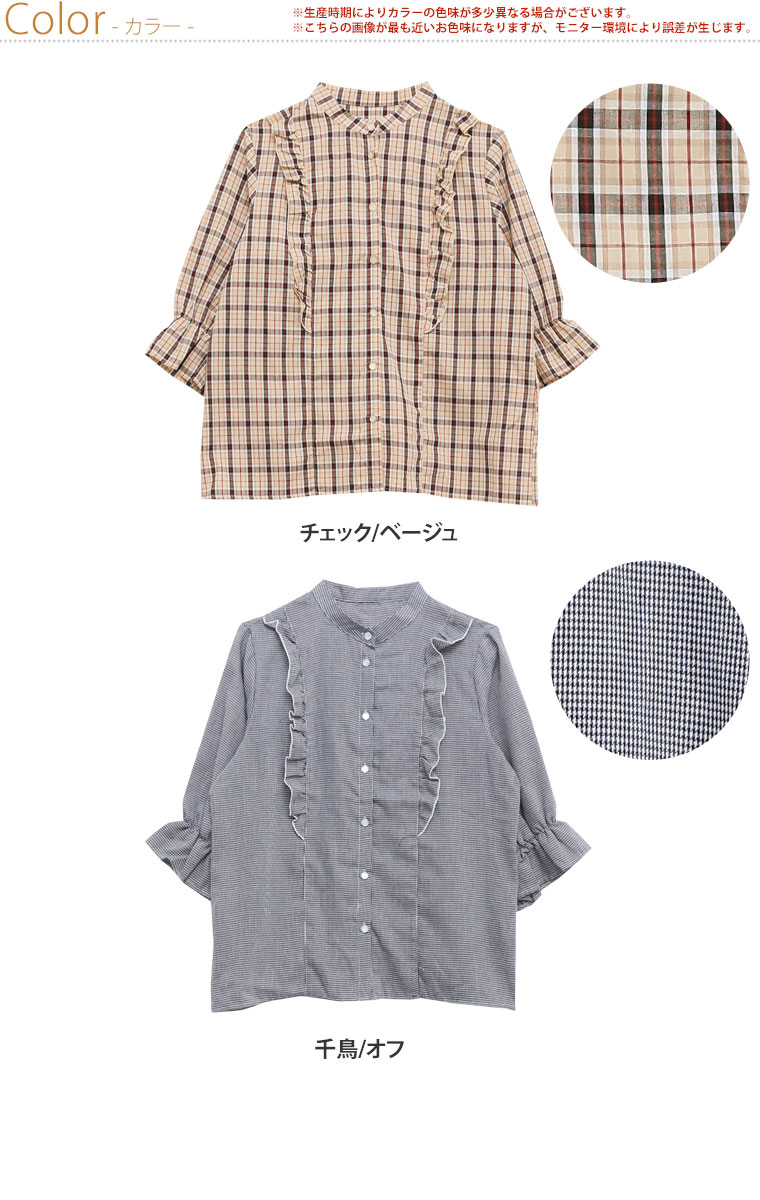 シーズン先取りのチェック柄2柄から選べる。先染めプチハイフリル七分袖ブラウス