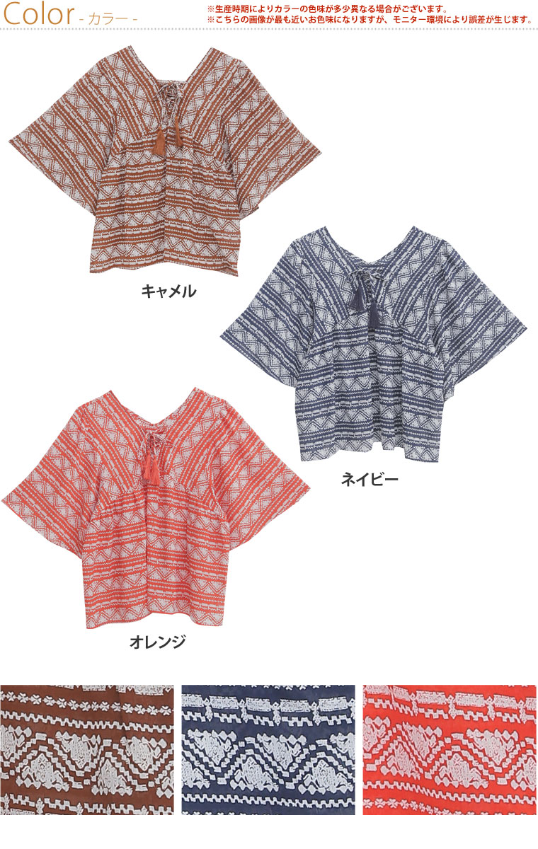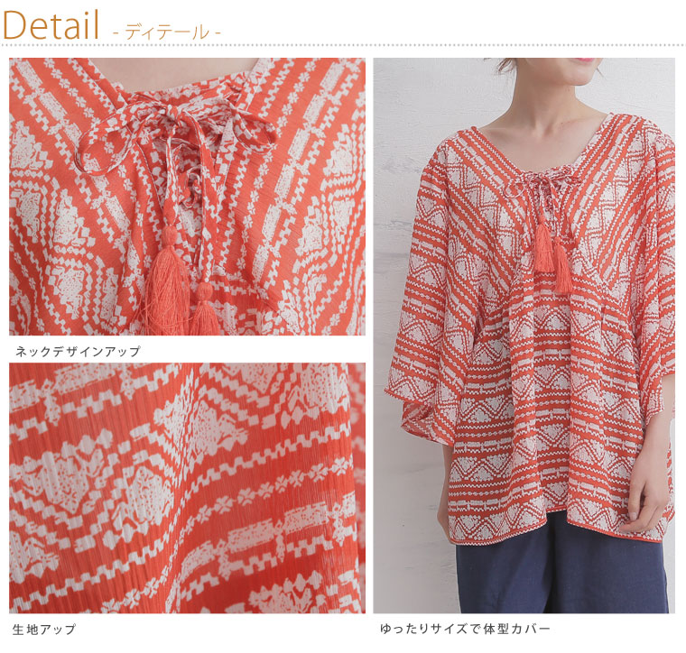 エスニックデザインで大人っぽく着こなす。ギャザーブラウス