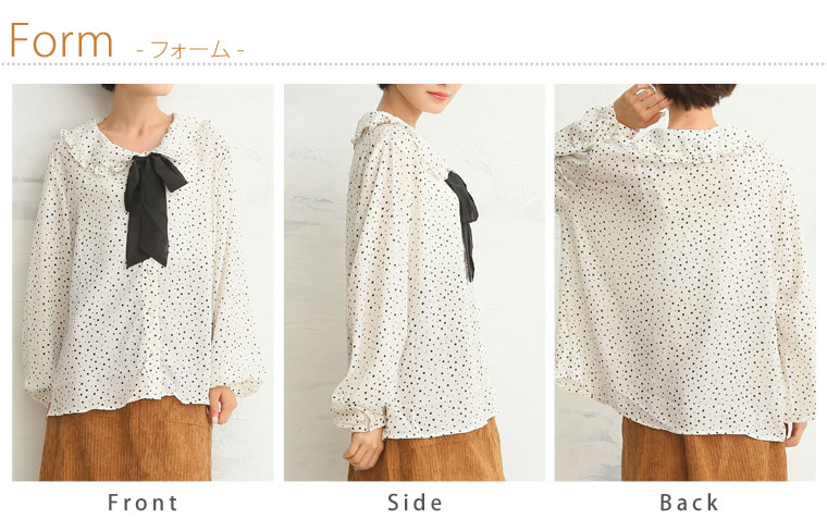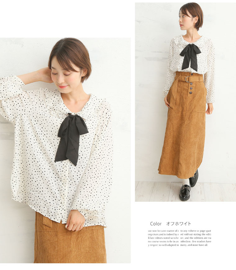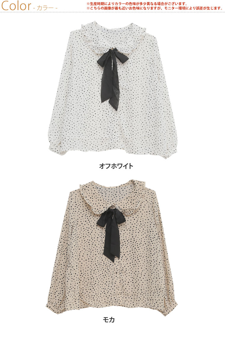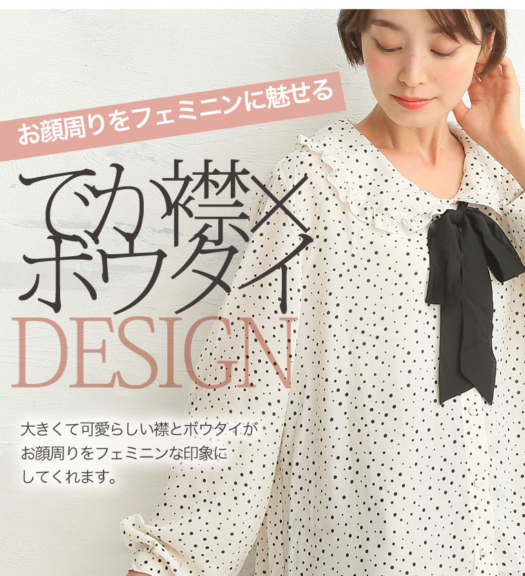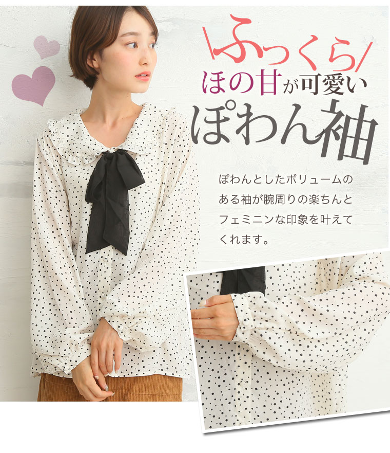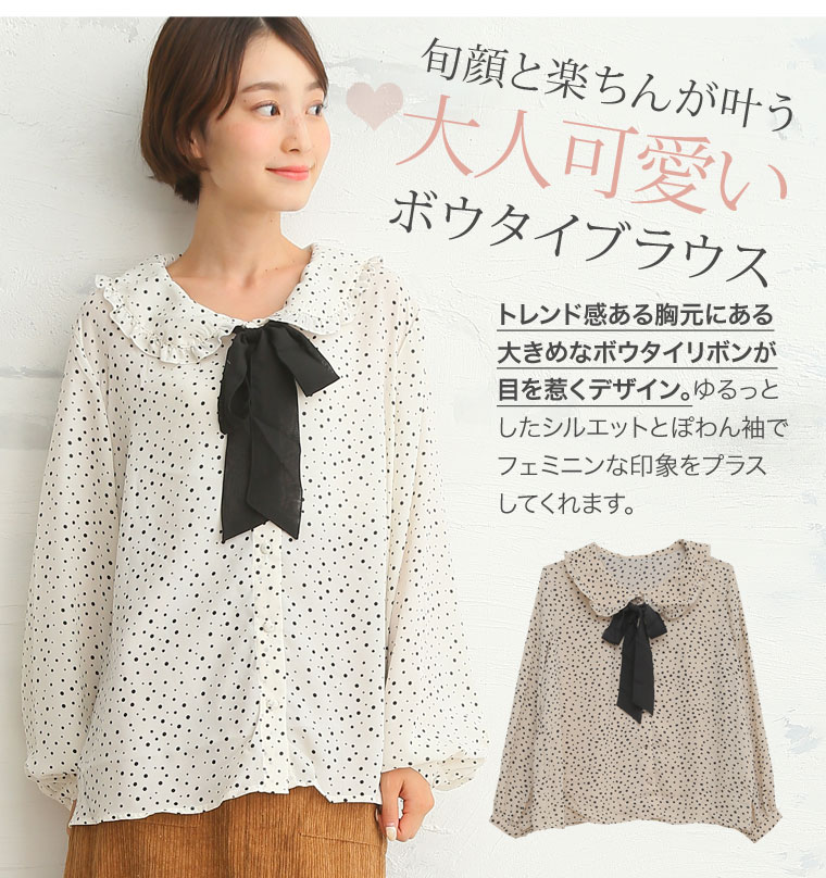 フリル襟が華やかなアクセント!!旬のボウタイデザインドットブラウス