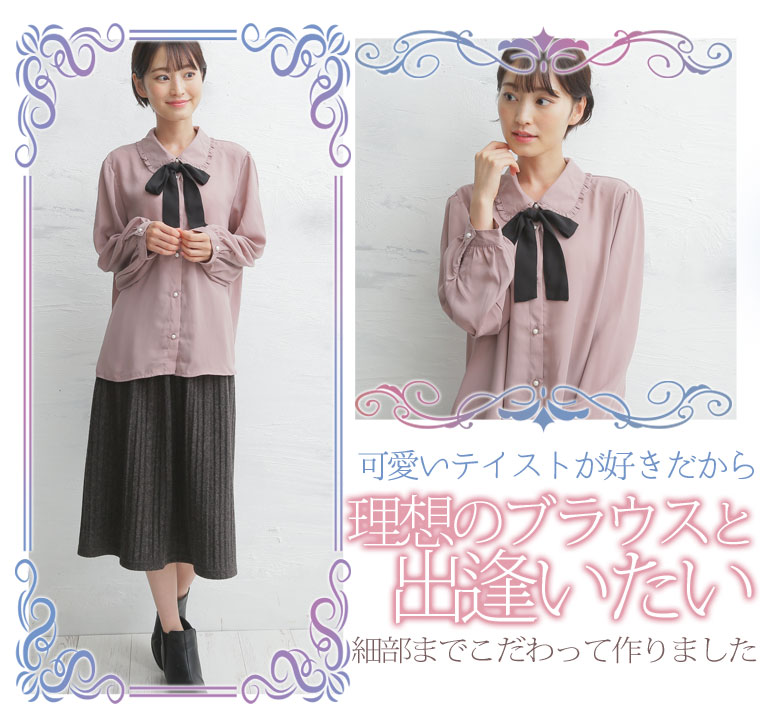 リボンタイとキラキラボタンが乙女心をくすぐる襟フリルリボン付きジョーゼットブラウス