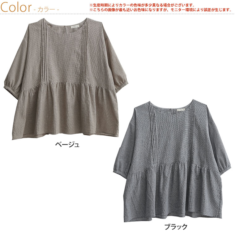 5. 大きいサイズ 綿麻素材 ピンタック 裾 ギャザー ブラウス