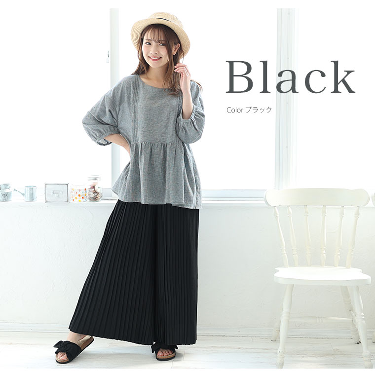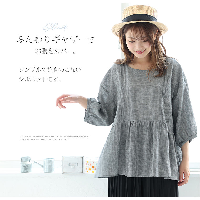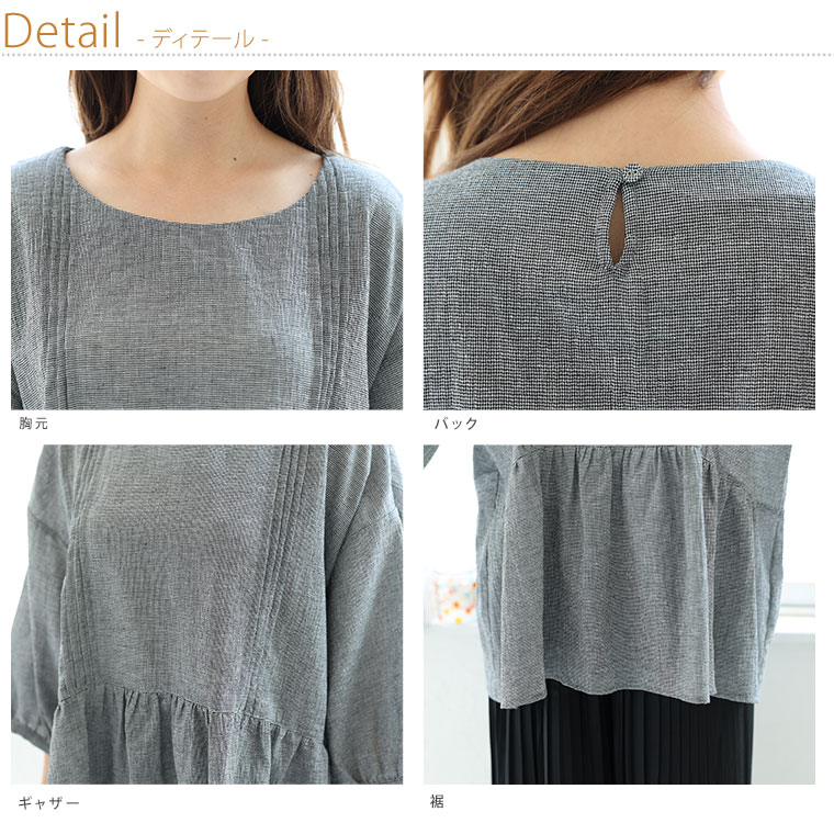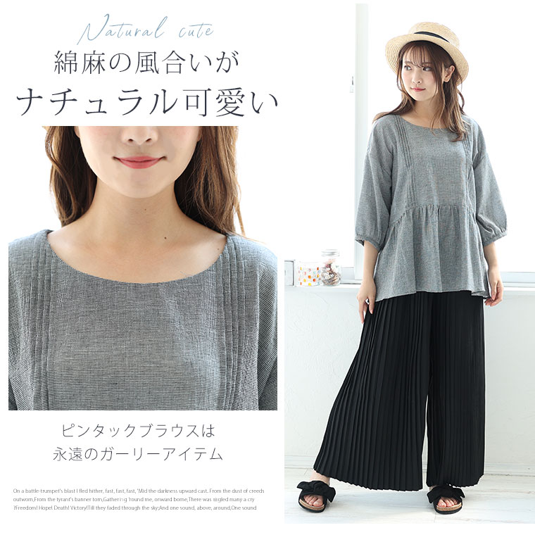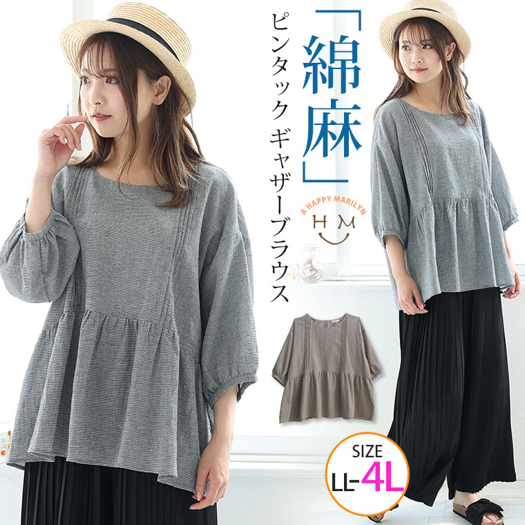 6. 大きいサイズ 綿麻素材 ピンタック 裾 ギャザー ブラウス