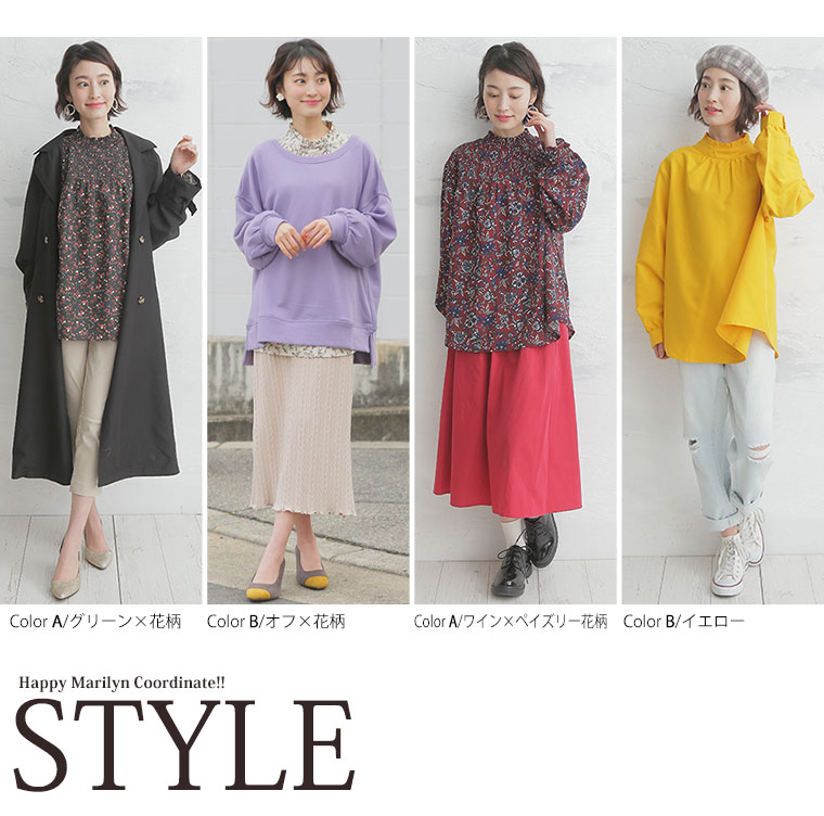 コーデ商品…(B/グリーン×花柄)【類似品】パンツ(B/オフ×花柄)トップス(A/ワイン×ペイズリー花柄)スカート(B/イエロー)【類似品】パンツ