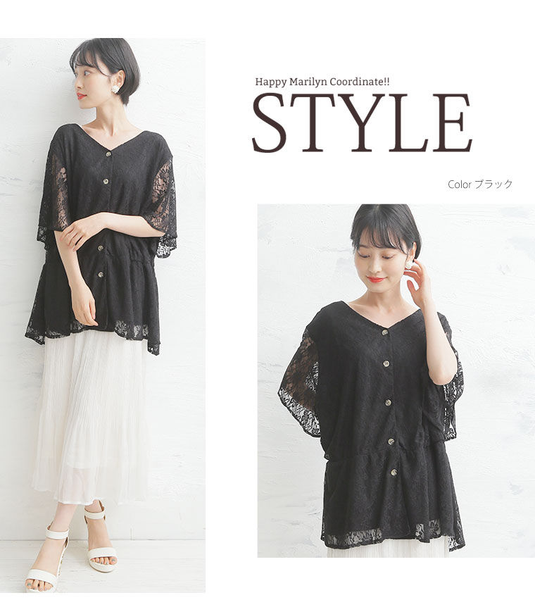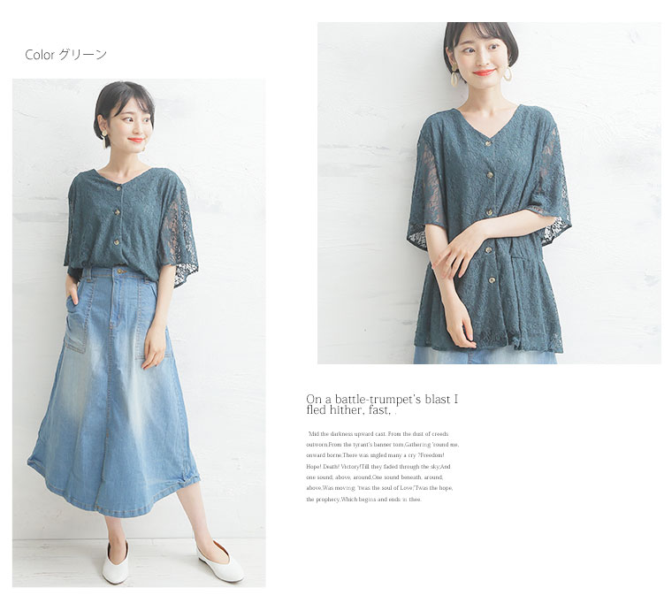 きちんと感があるレースのブラウスで程よく肌見せもでき涼し気に見えます。ゆったりと着用でき裾がフレアなので腰回りもカバーできました。